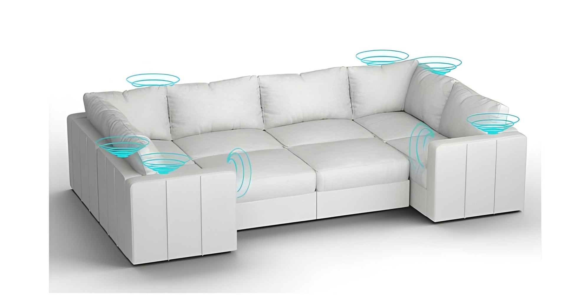 A: The 8-speaker system is seamlessly integrated into the furniture, while the built-in charging ports offer easy access to power your devices while relaxing.