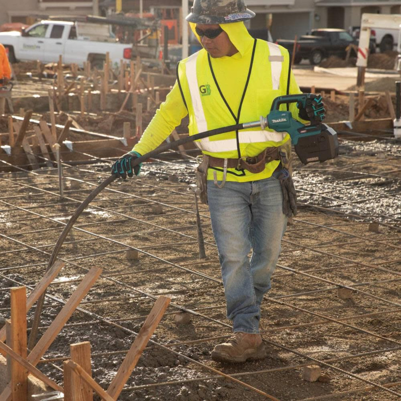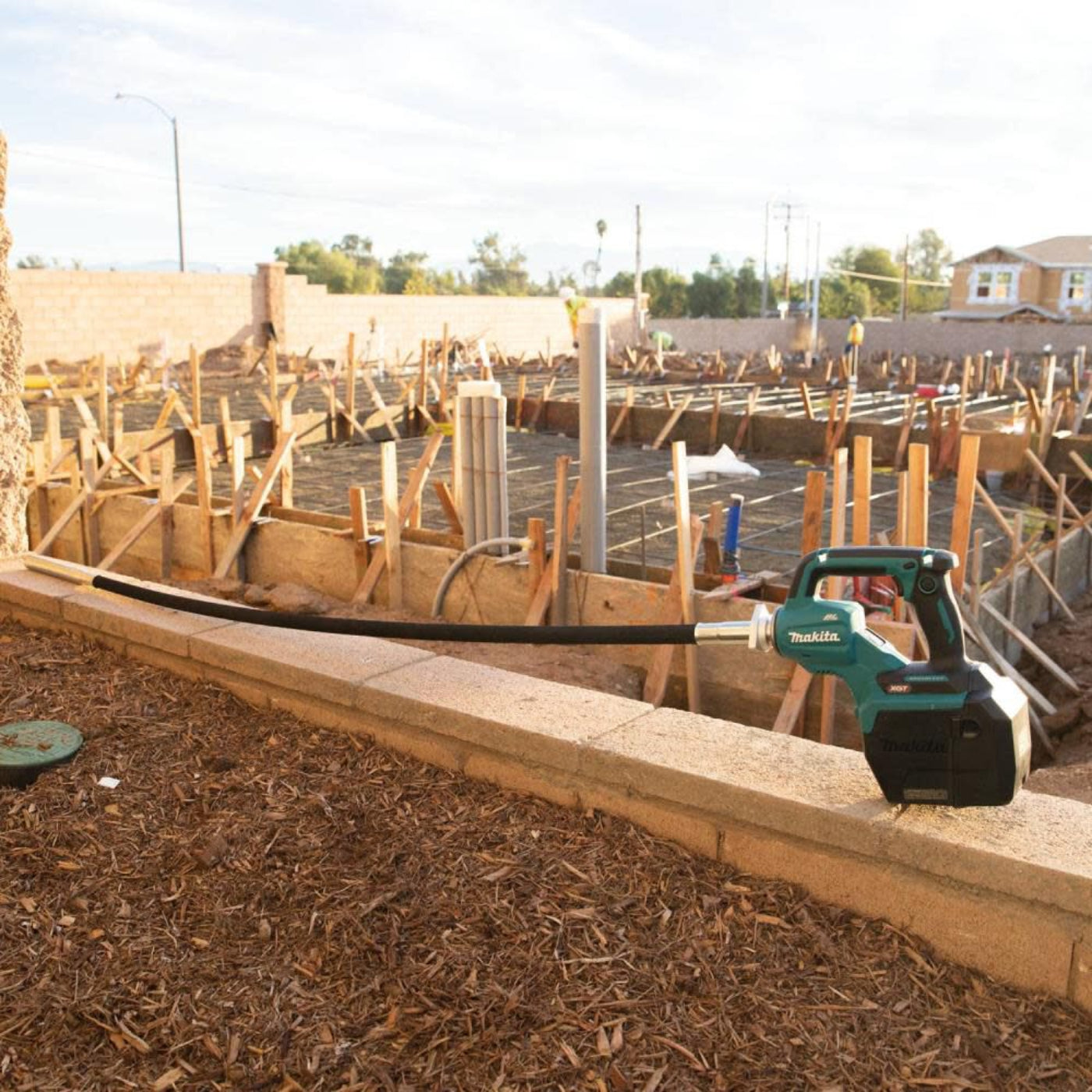 The Makita cordless 5โ1/2 ft concrete vibrator is run by brushless motor that delivers 15500 VPM and provides maximum run time of up to 45 minutes in normal mode and 60 minutes in power mode for strengthening concrete. The power mode helps in selecting the appropriate power level for wide range of applications including compaction of floors, pillars and mat foundations. Dual directional switch improves versatility and convenience to hold the tool in either horizontal or vertical positions for easy access to hard-to-reach areas. By covering the switch and battery, the tool is protected from external elements. The 1-1/4 Inch Dia vibrator with 5-1/2 ft shaft ensures uniform finish and helps in reducing defects in the concrete. The 77 Inch long compact and ergonomic design make it easy to handle and reduces fatigue during extended use. Digital communication features an XGT technology to protect the battery from over-heating, over-discharge and over-loading. Battery and charger sold separately.