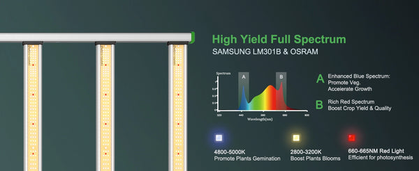 Professional Full Spectrum Lighting:Â The full spectrum of the FC 1000W is enhanced in the blue and red light bands. Blue light stimulates plant growth and promotes the accumulation of phytochemicals. Rich red light improves plant maturation and flower quality.