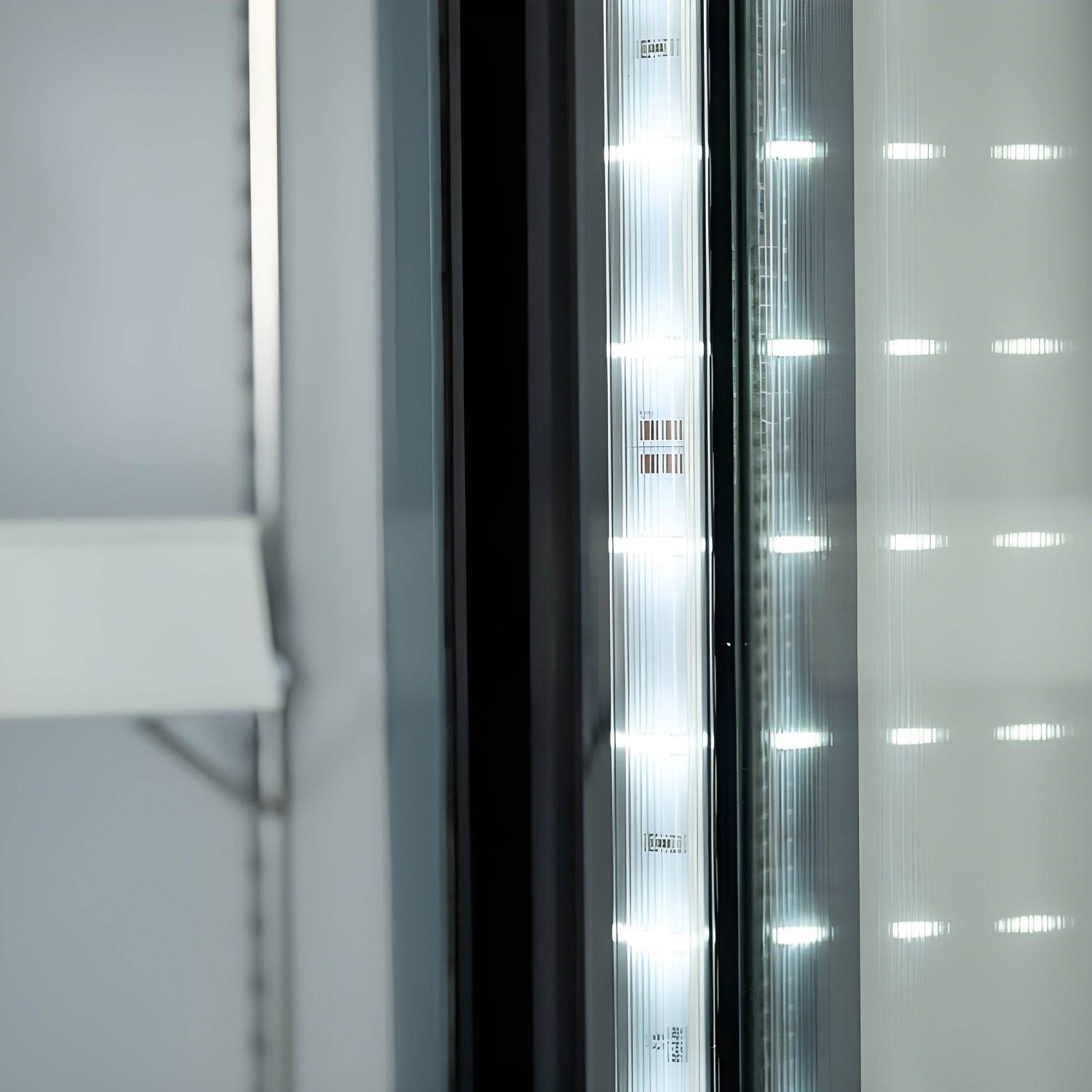 - Interior LED lighting illuminates the contents of the merchandiser, enhancing product visibility and presentation