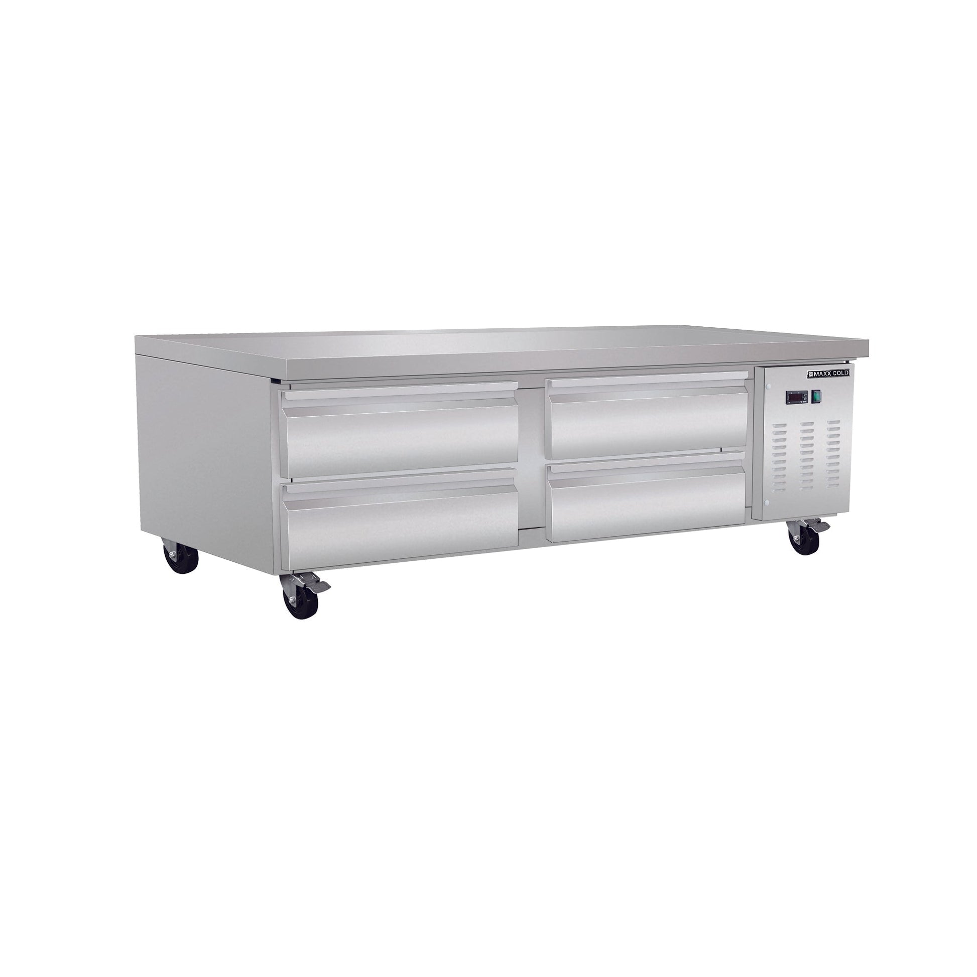 Maxx-Cold MXCB48HC 74-Inch-Wide Four-Drawer Refrigerated Chef Base in Stainless Steel with 11.1 Cu. Ft. Storage Maxx Cold MXCB72HC four-drawer refrigerated chef base is designed to streamline your foodservice operations. Our chef base drawer models provide plenty of refrigerated storage space and quick, easy access to your food items. Constructed of all stainless steel, this commercial chef stand can also accommodate heavy countertop equipment such as grills providing extra food preparation space. The 74” refrigerated chef base provides up to 11.1 Cu Ft (314 L) of storage. Equipped with four (4) 5” diameter swivel casters, two with brakes, full extension drawer slides, easy to grip recessed door handles and LED temperature display, this Maxx Cold refrigerated commercial chef base is a sure investment for successful operations. This durable commercial kitchen equipment unit is energy efficient, since it is engineered with solid-state digital controls and a forced-air system which delivers consistent, easily adjustable temperature performance. The condensate evaporator is integrated to the unit, meaning no drain line connection is needed. Temperature control and energy costs are further optimized with urethane insulated foam walls and drawers. Front breathing refrigeration system utilize eco-friendly R290A refrigerant.  If your foodservice operation and kitchen requires a lower profile, shorter casters options are available to comply with ADA (American Disability Act).