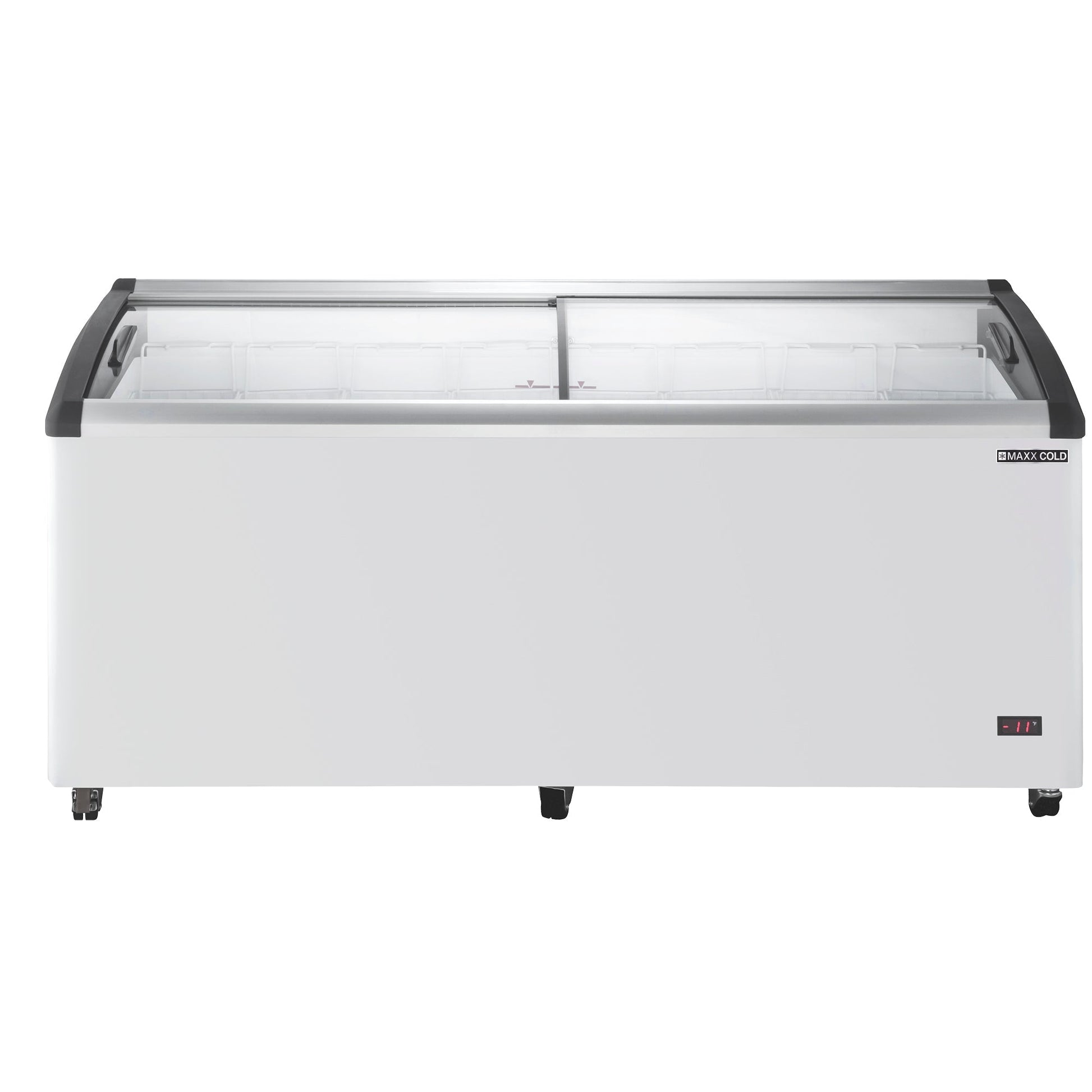 This Glass Display Freezer Merchandisers offers a spacious interior that provides up to 14.30 Cubic Ft. (405 L) of freezer storage space to store ice cream and other frozen items in an elegant and convenient presentation. The clear, curved glass sliding lids are equipped with easy grip handles, and the unit contains 2 flat wire baskets with compartments. This commercial chest freezer display is engineered with thick 2.5” foamed in-place and environmentally friendly wall insulation (polyurethane), interior LED lighting making it easier to see selection and enhance product’s appearance, and a molded plastic lid frame that is heated to prevent frost and ice build-up. Furthermore, this curved glass top freezer display is equipped with an internal condensate evaporator pan, so no floor drain is needed. This Maxx Cold freezer is constructed of durable, white powder coated, baked on enamel steel and a white powder coated finish for easy cleaning.