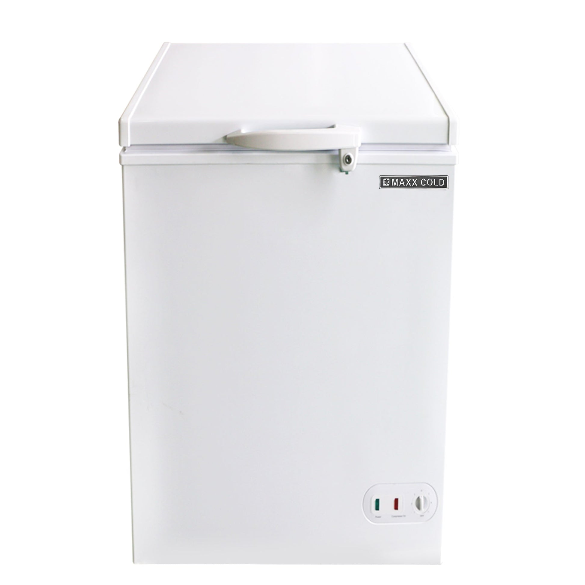 This compact Maxx Cold Select Series chest freezer with a solid hinged lid top is ideal for safely storing frozen food products such as meat, packaged foods, ice cream, vegetables, desserts and bagged ice and provides up to 3.4 Cubic Ft. (96 L) of storage. Its convenient interior storage basket(s) allows you to organize your products and quickly retrieve what you need. The large environment friendly insulation foam this unit is engineered with ensures excellent refrigeration, keeping frozen products safely stored even in extreme low or high ambient temperatures. The CFC-free urethane foam insulation helps store contents safely for up to 2 days in the event of a power outage. This unit is constructed from durable and easy to clean white powder coated steel exterior and aluminum interior. The hinged top lid is designed with an integrated handle and can be locked when needed. This unit is equipped with one (1) heavy-duty coated wire storage basket, and four rollers for mobility, and adjustable wire shelves (one per section/door). The freezer's integrated condensate evaporator pan eliminates the need for a floor drain connection. Premium functions on this commercial chest freezer include a manual defrost function, an efficient cold wall system that delivers even temperature regulation throughout the storage compartment, and an easily adjustable temperature control system.