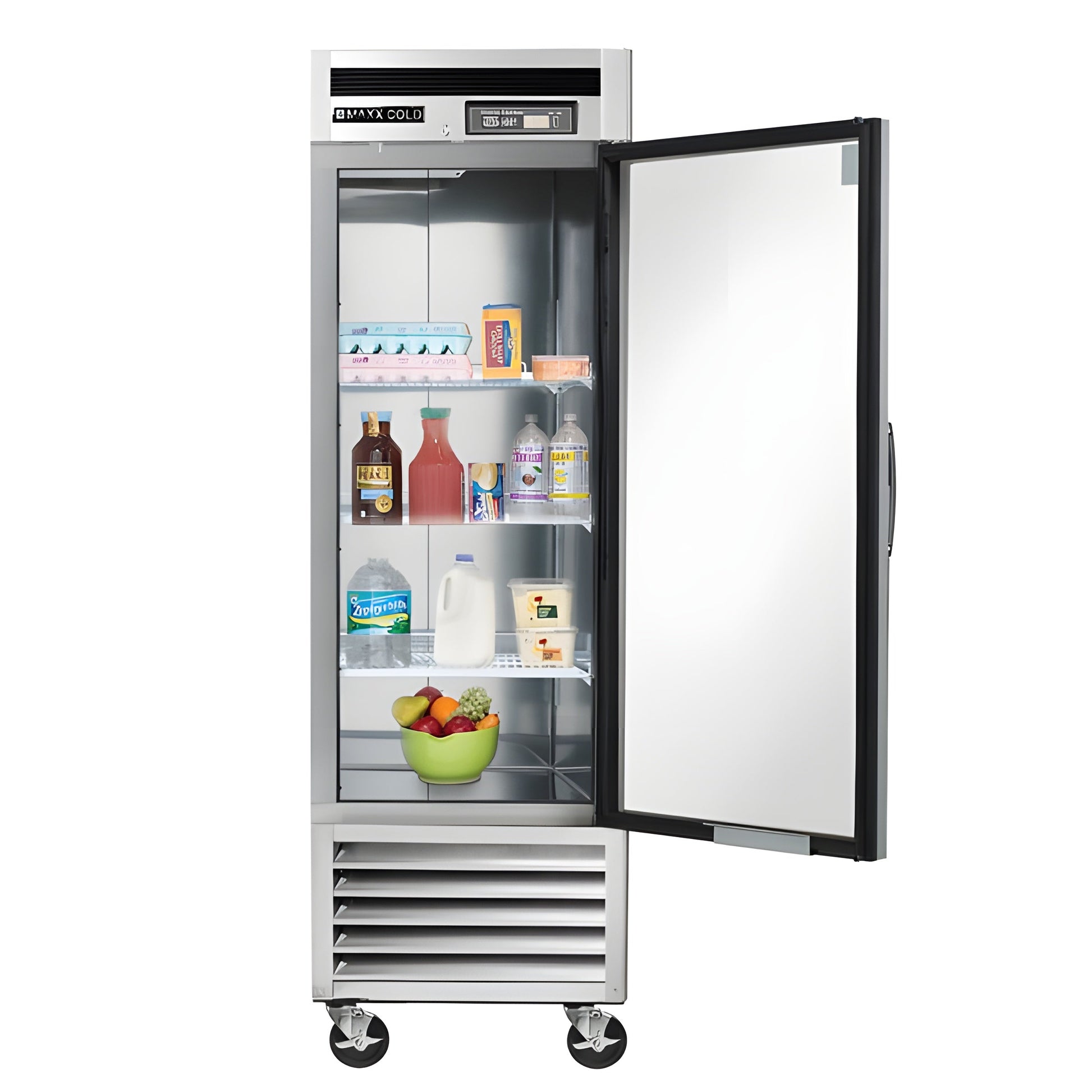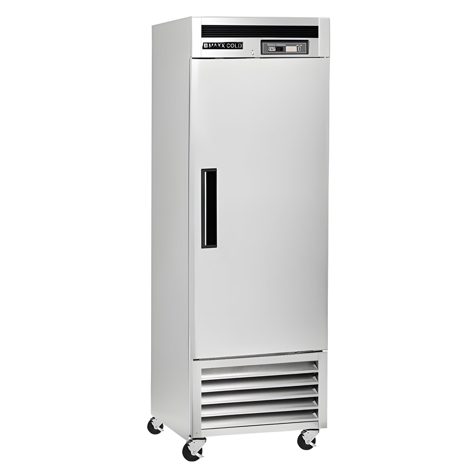 Maxx Cold 26.75 inch wide single door reach-in refrigerator is designed to assist you in meeting all food service industry requirements while making its content easy to access. The cabinet is equipped with 3 heavy-duty fully adjustable and easy to clean PE coated wire shelves which can hold full size sheet pans and provides up to 23 cubic ft. (651 L) of storage capacity, while the unit's slender and solid build makes it a great choice for limited or compact spaces. In addition, this commercial refrigerator is engineered with an open-door alert that beeps if the refrigerator is left open for five minutes and the single door model is field reversible. The Energy Star reach-in commercial grade refrigerator is constructed of stainless-steel (interior and exterior) and is mounted on 5” diameter swivel caster wheels that can easily be maneuvered. Standard features on this premium indoor refrigerator include integrated energy saving interior LED lighting, automatic defrost function, lock and key set for security and digital temperature control which maintains optimum temperature throughout the unit. Digital temperature display can be viewed from outside the cabinet, which is engineered with an integrated condensate evaporator; meaning no drain line connection is needed. The polyurethane foam insulation on this one-door commercial refrigerator provides outstanding thermal regulation and is energy efficient. Furthermore