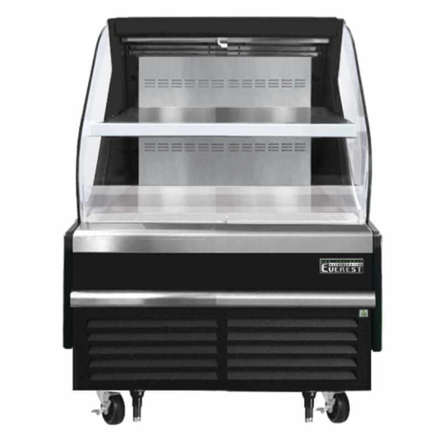 The evaporator coils and condenser are large capacities and corrosion-resistant. The fan motors are electronically commutated and can achieve rapid cooling with less energy consumption. There is also shielded LED bar lighting, located under shelves and the canopy, which provides high color illumination with low heat output. The factory preset temperature is 35°F. The two-tier shelf riser is removable.