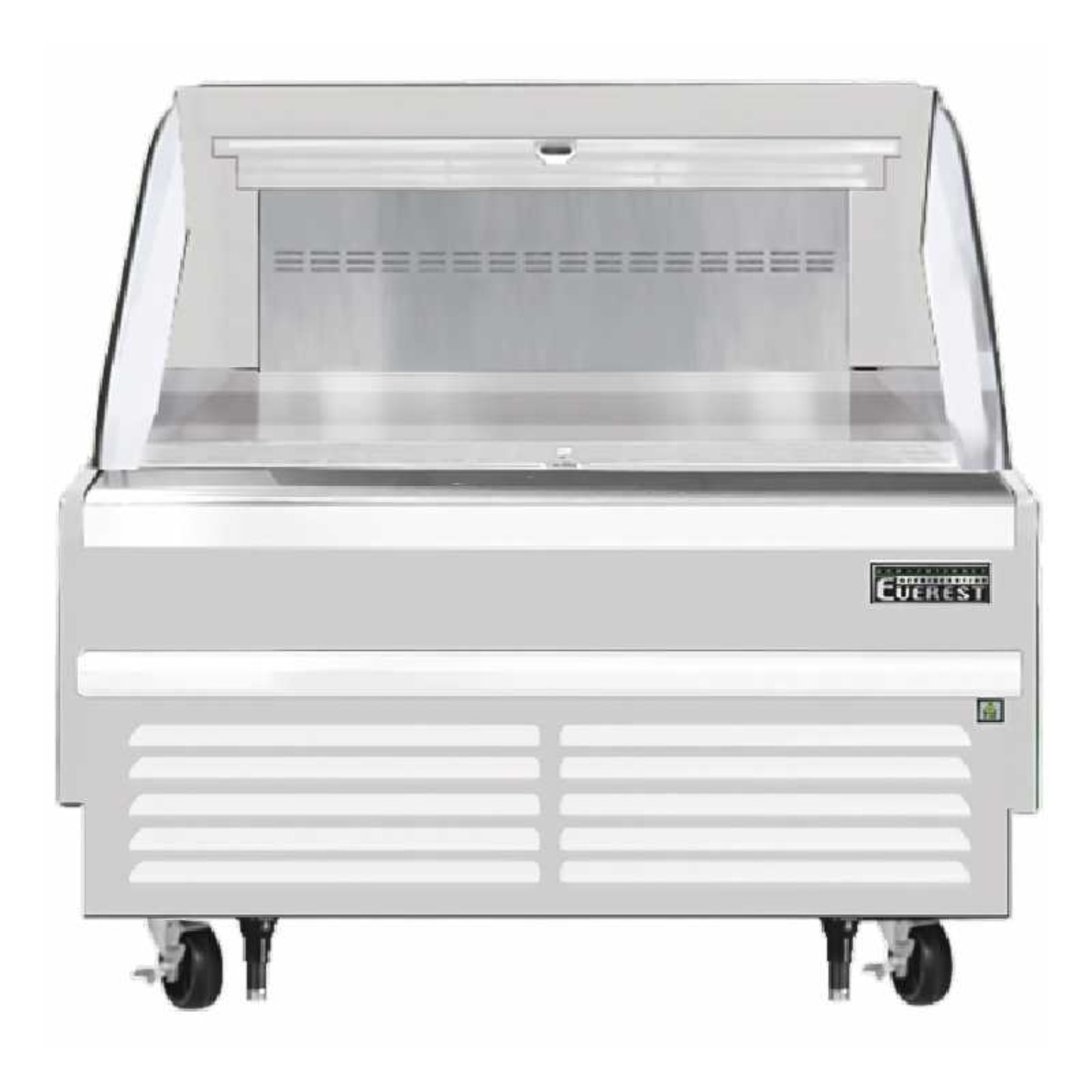 The evaporator coils and condenser are large capacities and corrosion-resistant. The fan motors are electronically commutated and can achieve rapid cooling with less energy consumption. There is also shielded LED bar lighting, located under shelves and the canopy, which provides high color illumination with low heat output. The factory preset temperature is 35°F. The two-tier shelf riser is removable.