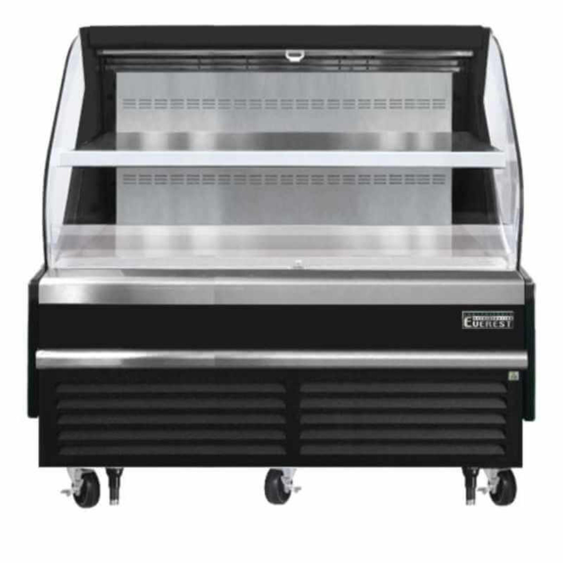 The evaporator coils and condenser are large capacities and corrosion-resistant. The fan motors are electronically commutated and can achieve rapid cooling with less energy consumption. There is also shielded LED bar lighting, located under shelves and the canopy, which provides high color illumination with low heat output. The factory preset temperature is 35°F. The two-tier shelf riser is removable.