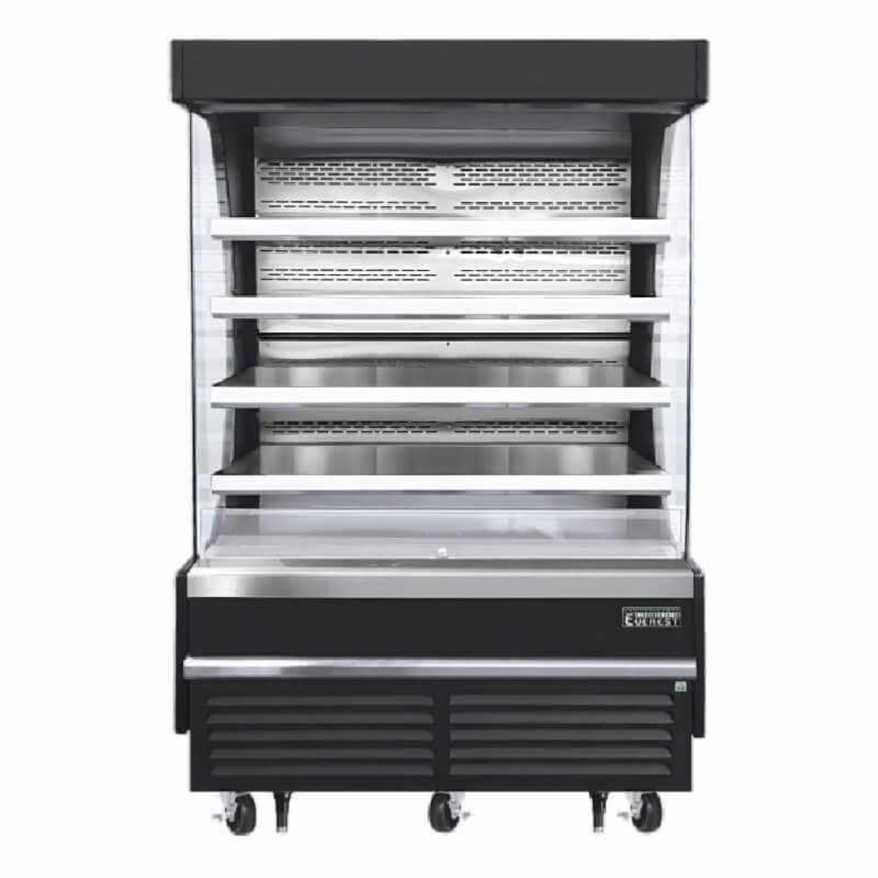 The evaporator coils and condenser are large capacities and corrosion-resistant. The fan motors are electronically commutated and can achieve rapid cooling with less energy consumption. There is also shielded LED bar lighting, located under shelves and the canopy, which provides high color illumination with low heat output. The factory preset temperature is 35°F. The two-tier shelf riser is removable.