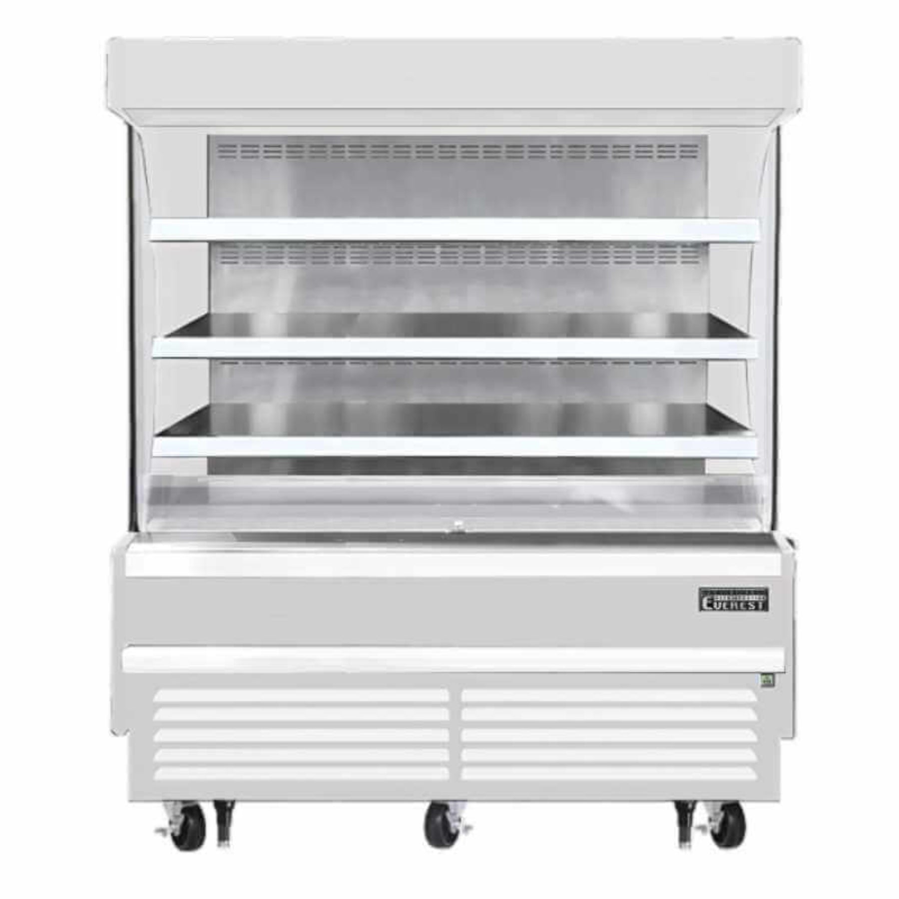 The evaporator coils and condenser are large capacities and corrosion-resistant. The fan motors are electronically commutated and can achieve rapid cooling with less energy consumption. There is also shielded LED bar lighting, located under shelves and the canopy, which provides high color illumination with low heat output. The factory preset temperature is 35°F. The two-tier shelf riser is removable.