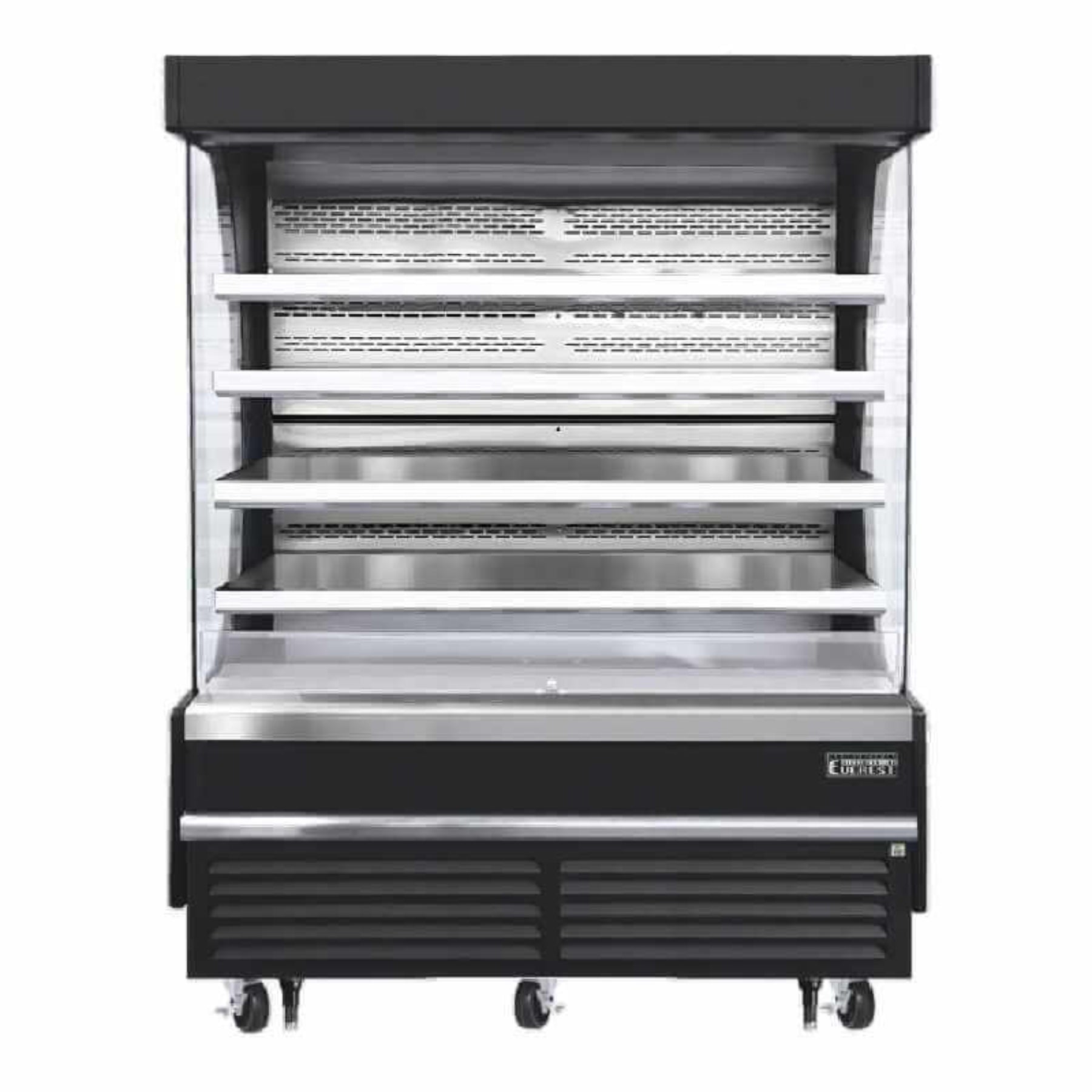 The evaporator coils and condenser are large capacities and corrosion-resistant. The fan motors are electronically commutated and can achieve rapid cooling with less energy consumption. There is also shielded LED bar lighting, located under shelves and the canopy, which provides high color illumination with low heat output. The factory preset temperature is 35°F. The two-tier shelf riser is removable.