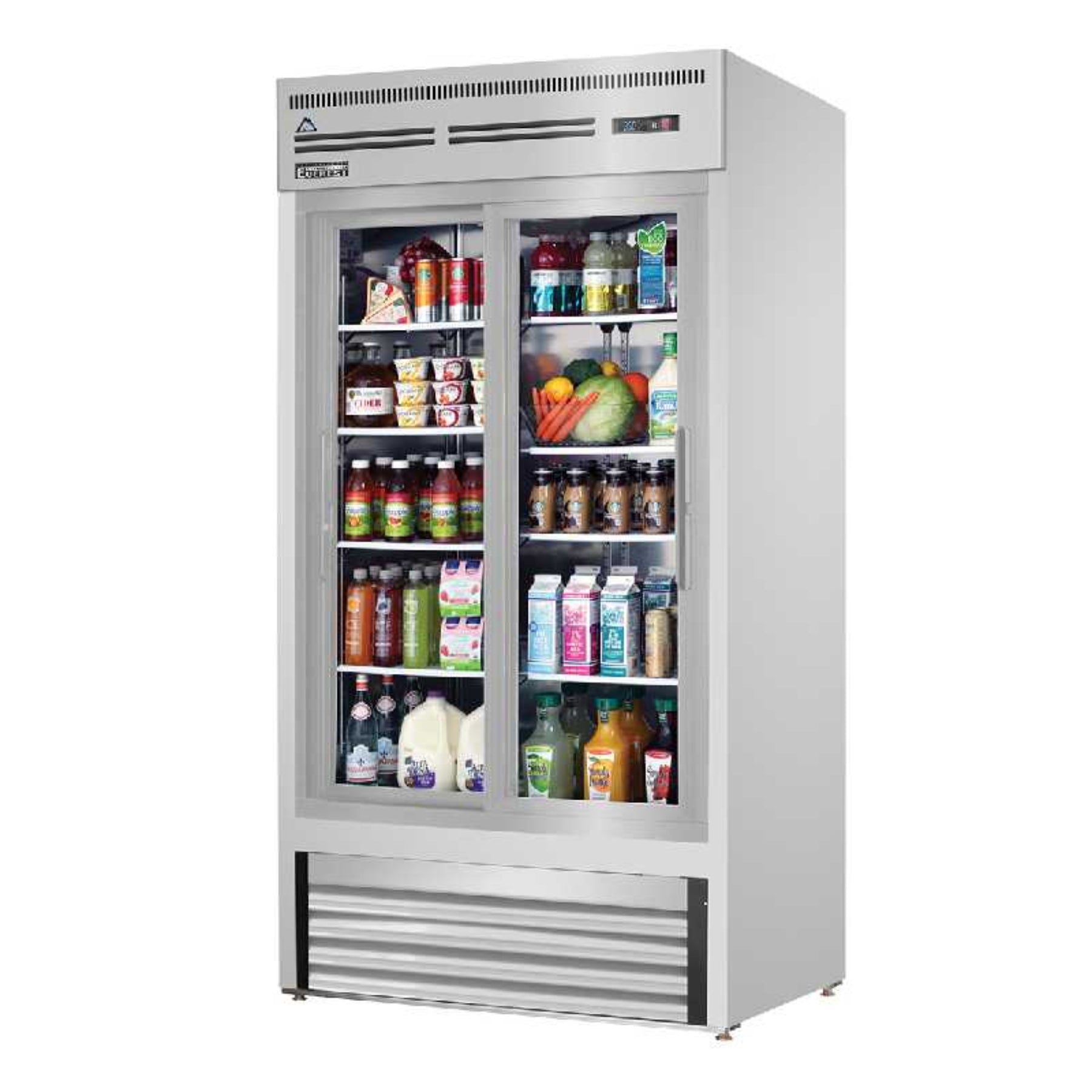 The EMGR33-SS is a 39-3/8" wide, two-section insulated single sliding glass door merchandiser refrigerator from Everest Refrigeration. This unit is equipped with 2 low emissivity double pane glass sliding doors, a stainless steel interior and exterior with 33 cubic feet of space as well as shielded LED interior lighting.