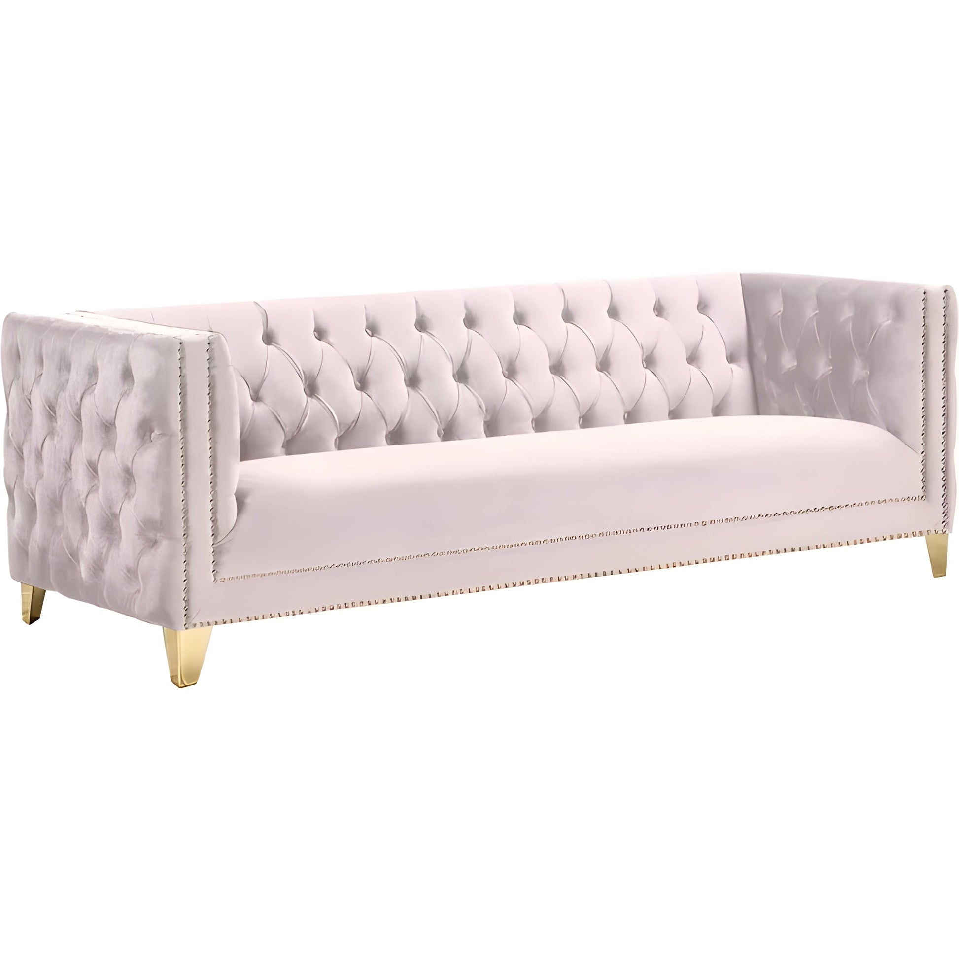 Elegant and eye-catching, the stunning Pink Velvet Michelle Sofa from Meridian Furniture is the perfect addition to any space. Deep button tufting and gold nailhead trim provides an added touch of modern to the velvet upholstery.