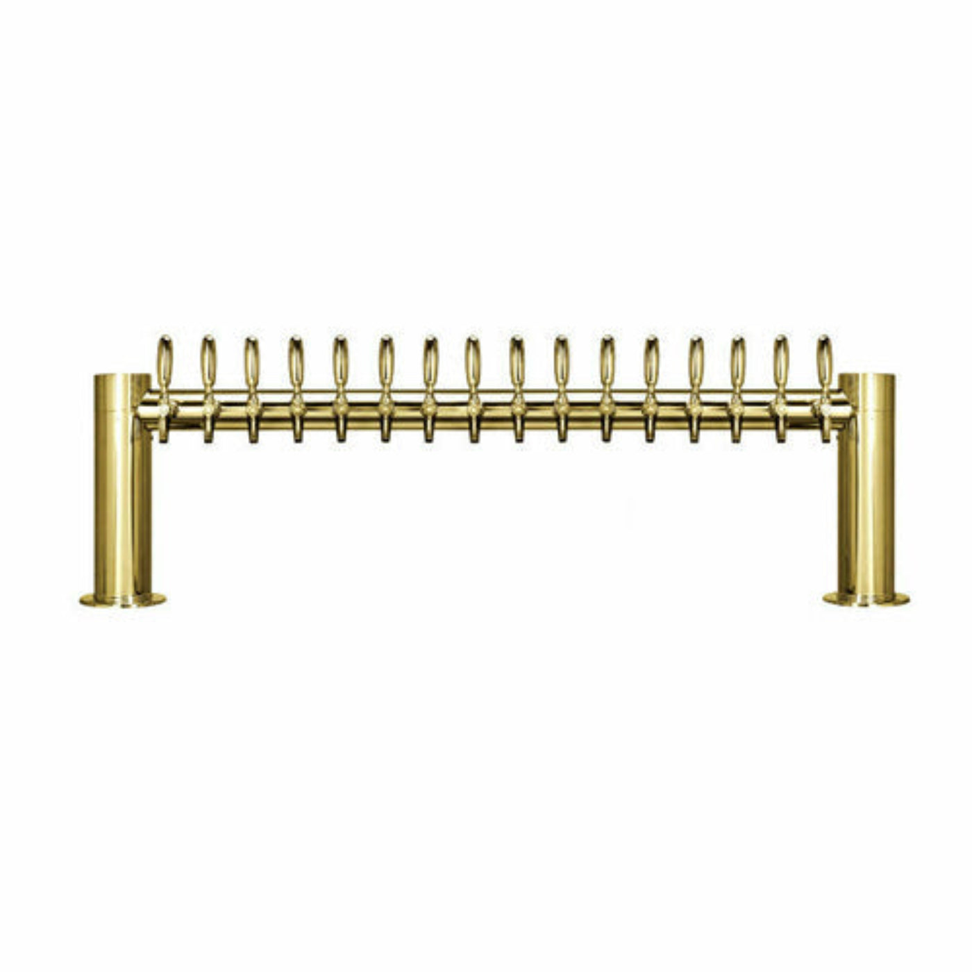 Metropolis "H" Draft Beer Tower, countertop, 56"W x 16"H, glycol-cooled (Kool-Rite™ integrated module), (16) PVD brass-plated stainless steel faucets (handles not included), 3" OC, 12" faucet clearance, (2) 4" dia. columns with 6" dia. bases, 304 stainless steel product lines & leak-proof shanks, includes cooling block & copper coolant lines, mounting gaskets & hardware provided, PVD brass finish, NSF