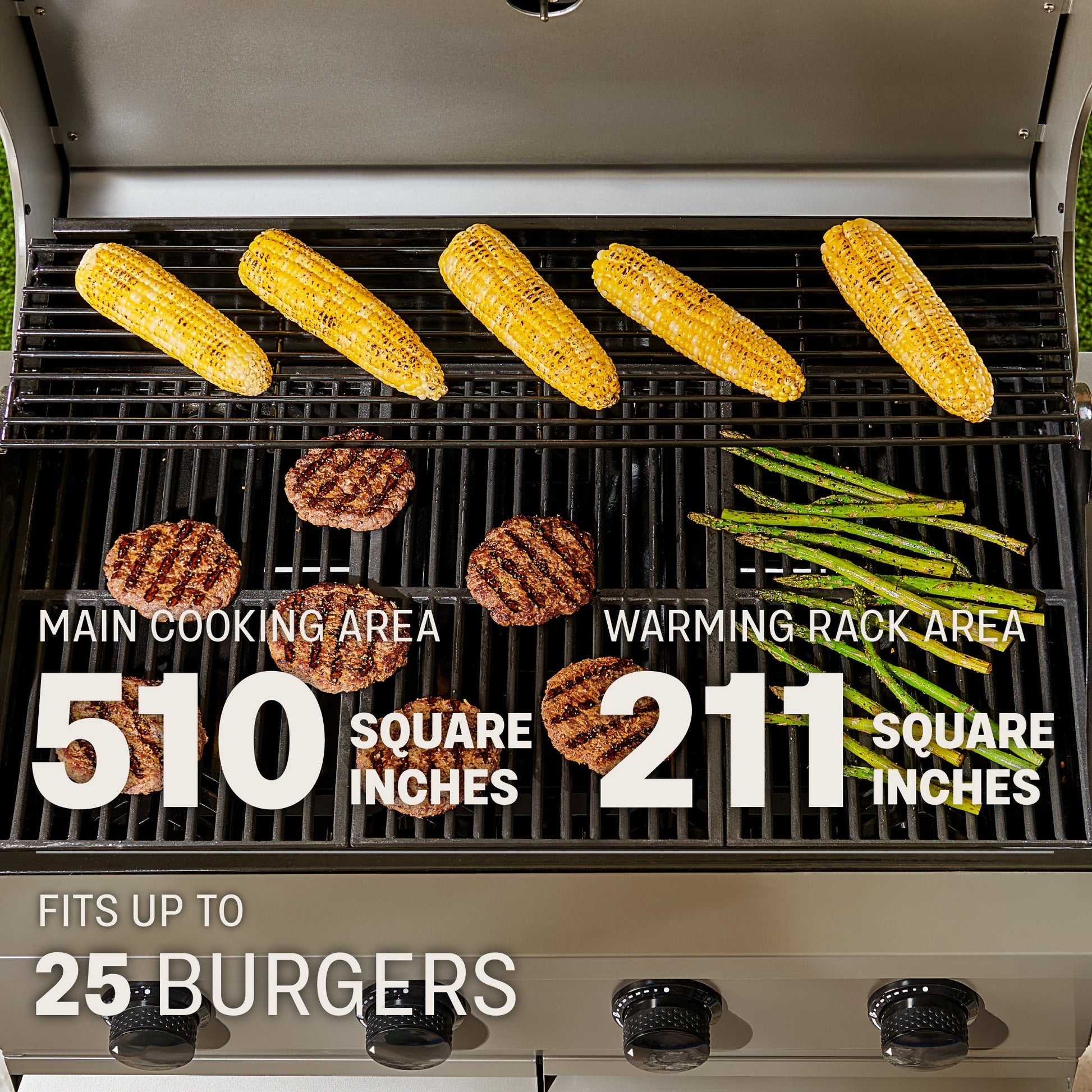 A: The gas grill delivers 721 sq in of cooking surface, the charcoal grill offers 421 sq in, and the griddle adds 352 sq in — plenty of space for large meals or gatherings.