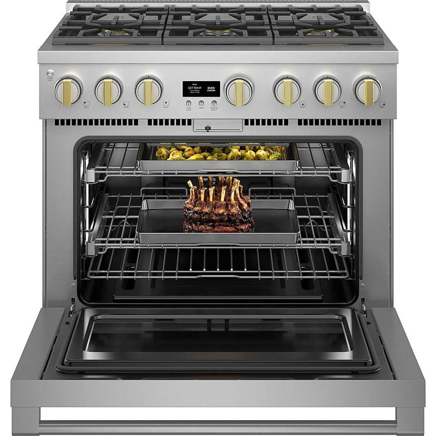 Professional-Grade Performance: The Monogram 6.2 Cu. Ft. Freestanding Gas Convection Range with 6 Burners offers powerful cooking performance with a spacious oven and multiple burner configurations, perfect for cooking large meals or multiple dishes at once.