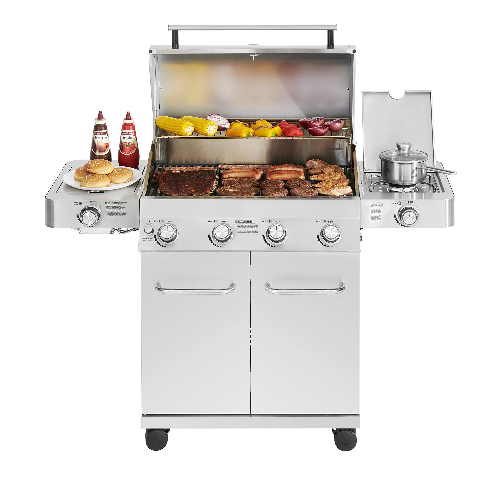 A: Yes, it features a standard side burner for sides and sauces, plus a high-heat sear burner for locking in flavor.