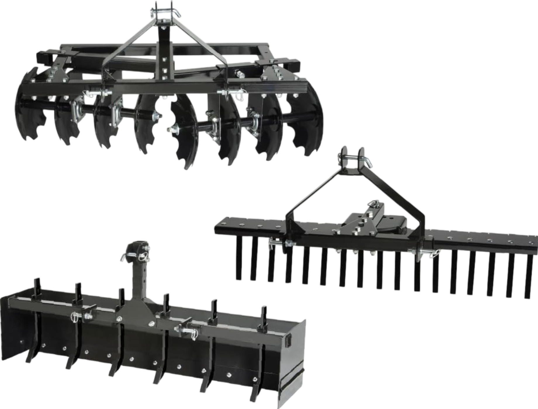 Complete 3-Piece Kit – Includes a disc plow, a cultivator, and a rake, providing a comprehensive system for soil preparation, weed control, and field maintenance.