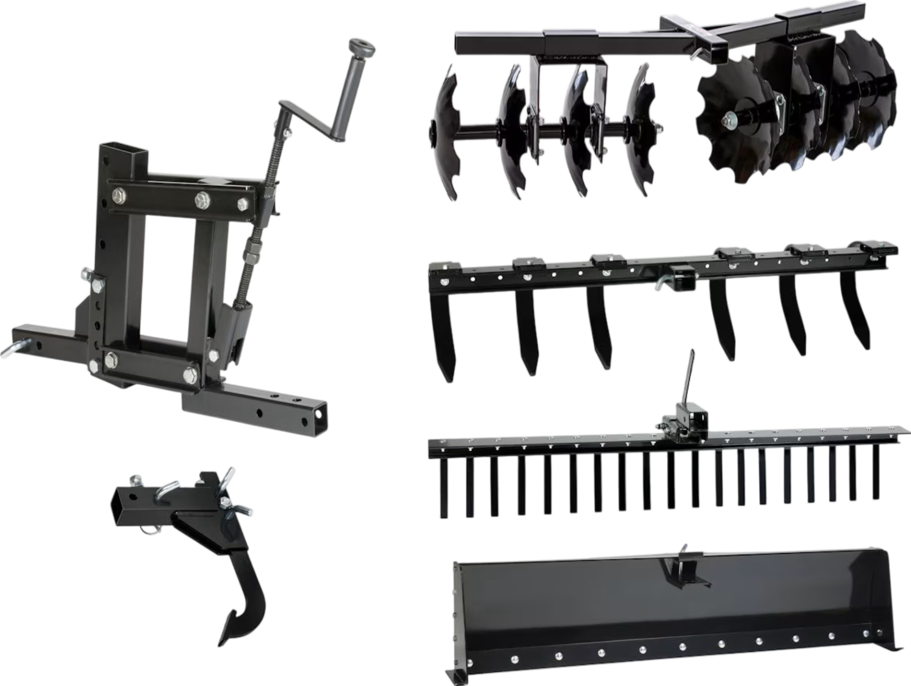 A: The kit includes 6 versatile implements, such as a disc plow, cultivator, harrow, box blade, plow, and rake, providing a complete solution for agricultural tasks.