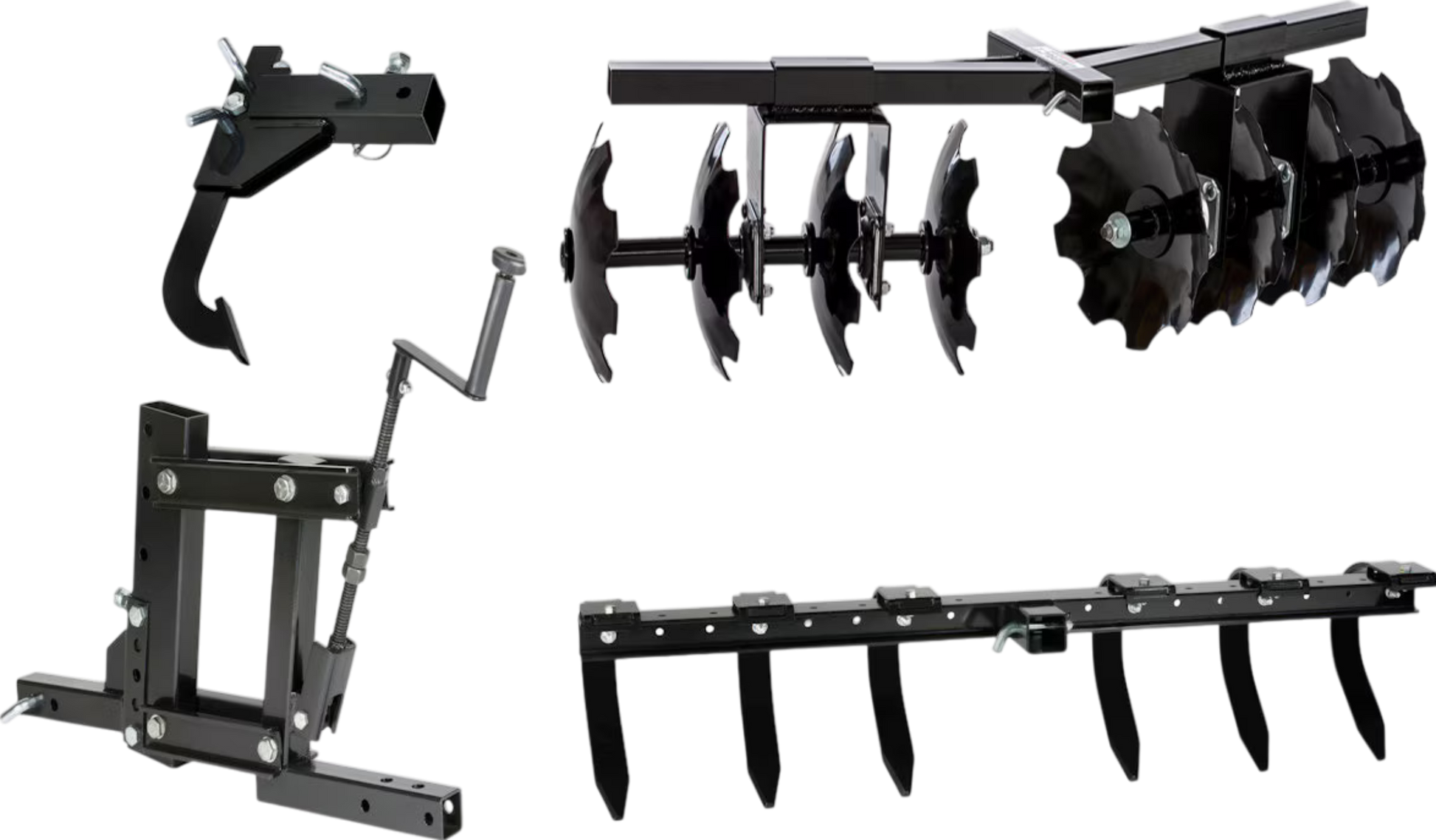 The Impact Implements New Soil Kit includes all the pieces needed to prepare soil, chop dirt clumps, prepare food plots, and more. Great tools for use around the farm, in the garden and on the lawn. Quick-attach, durable accessories go on and off easily with a single hitch pin. Manual lift and lower adjustments allow accessories to apply down-force for ground engagement. Easily installs into a 2-inch hitch style receiver already installed on the ATV, UTV, or lawn tractor.