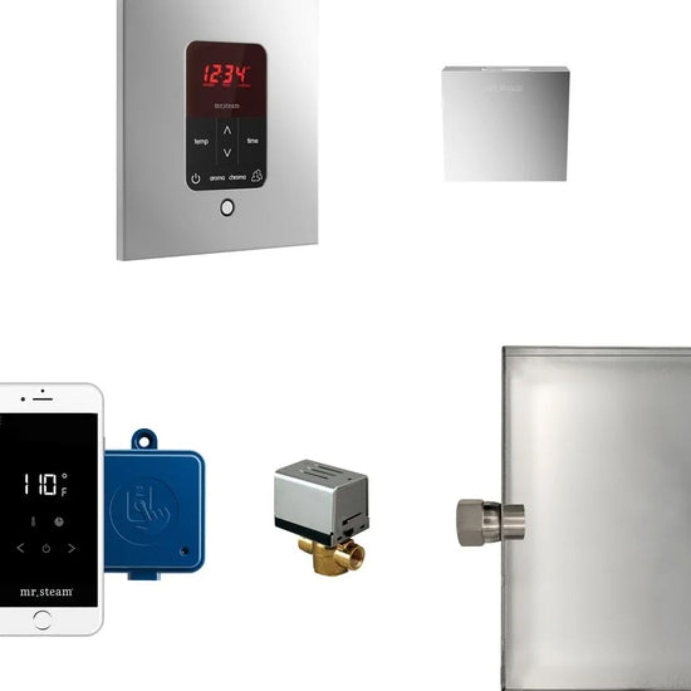 A: The Mr. Steam Butler Steam Generator Control Kit features a sleek square design with a polished chrome finish, offering a modern and luxurious look for your steam shower.
