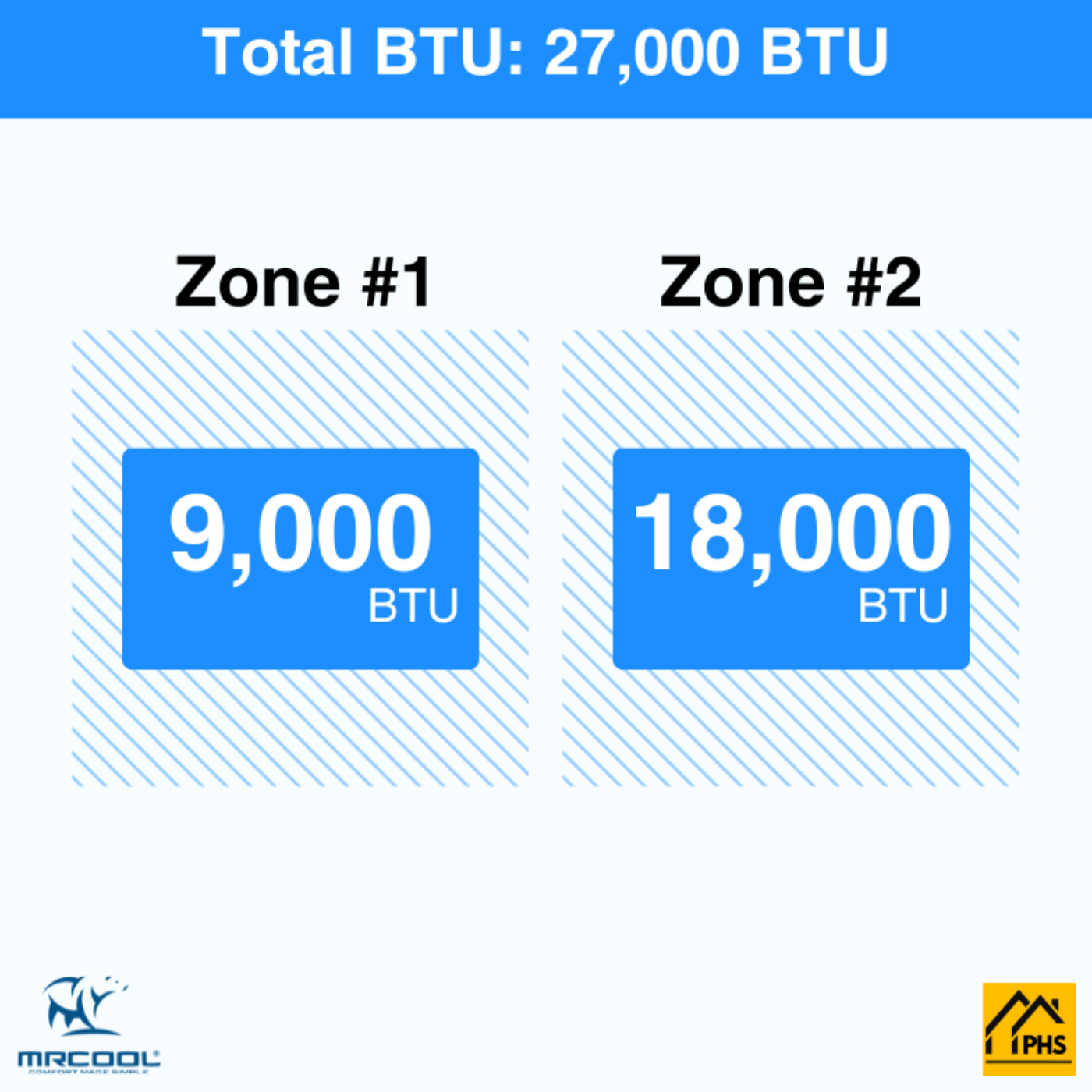 A: 27,000 BTU, built to handle multiple room sizes or combined living spaces.