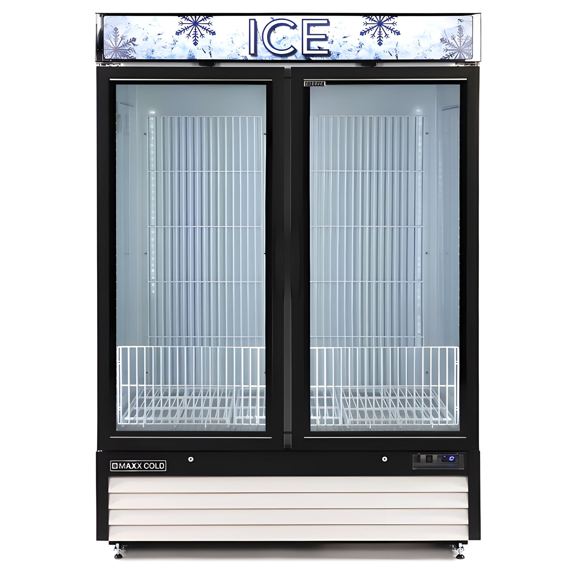Q: What are the main features of the Maxx Cold Double Glass Door Ice Merchandiser Freezer?