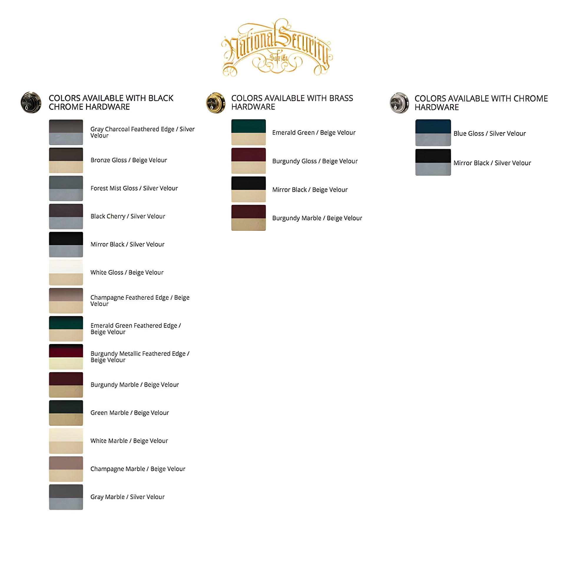 When it comes to the finish of the National Security Magnum 25 NS25, very few safes even compare. Just taking a walk around the safe a few features really stand out. First the high gloss paint jobs look better than a Mercedes, the external hinges not only allow the door to swing a full 180° but are also accented with decorative hinge caps and feathered edges included on some finishes create an authentic yet traditional look. As you turn the offset 5 spoke handle, you'll notice the included, auto on/off Clearview Light Kit brighten up the pin-dot velour fully upholstered 4-in-1 Flex interior.