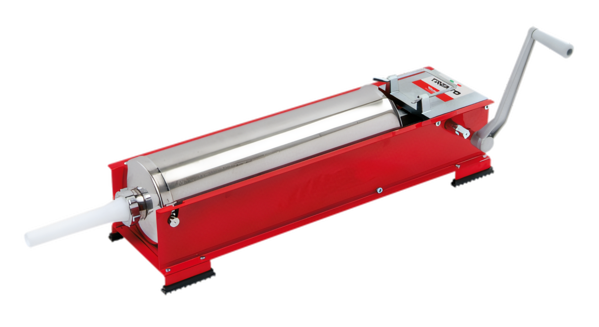A: Built with a red enameled steel frame and supplied with a selection of stuffing funnels for versatile casing sizes, making it robust and easy to clean.