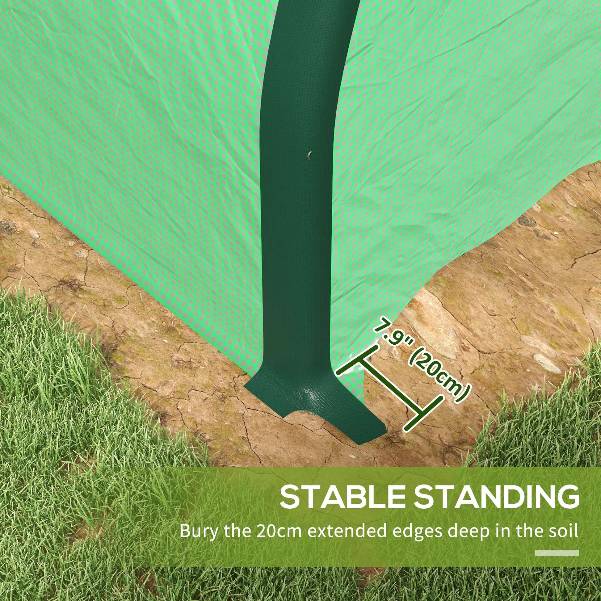 - Secure Your Large Greenhouse: Make sure to bury the extended edges of the greenhouse tarp 7.75" into the ground. Doing so will help stabilize your walk-in greenhouse by creating a seal to lock out rainwater and wind.