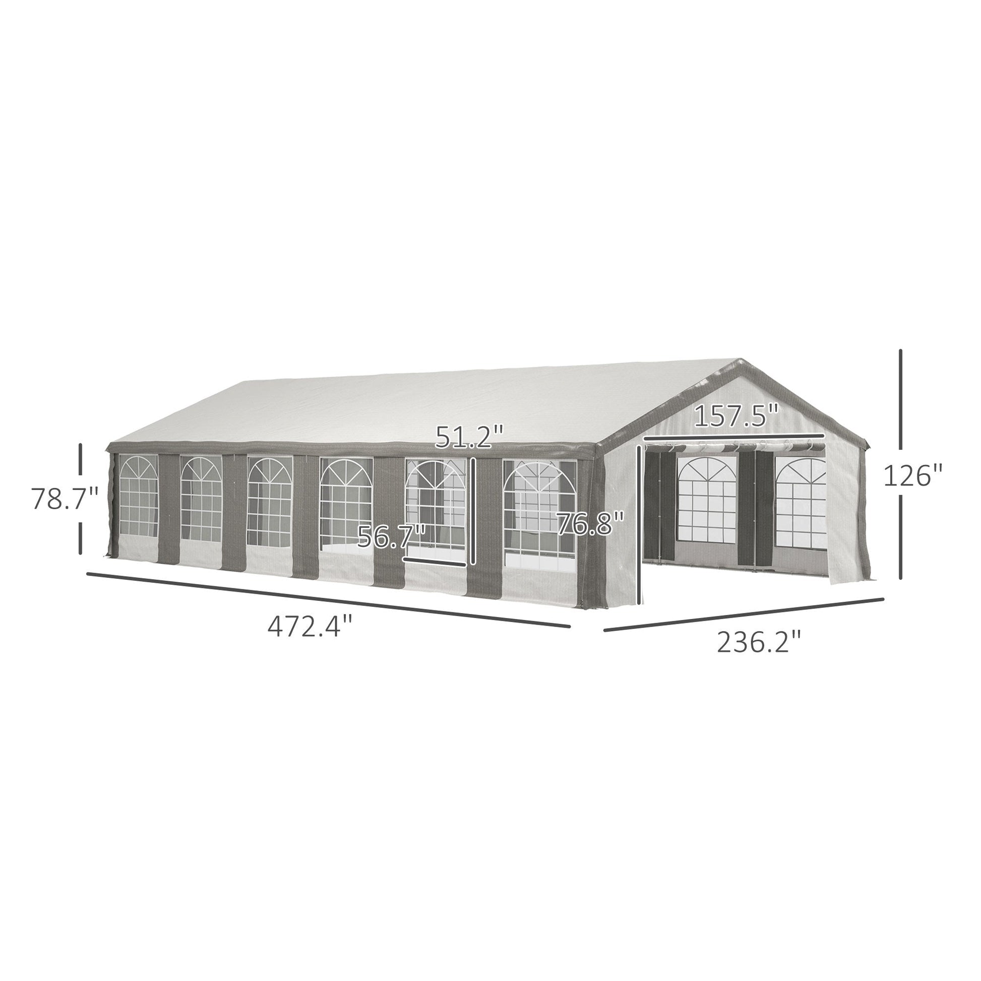 - Outdoor Carport & Party Tent Info: Overall Dimensions: 472.5" L x 236.25" W x 126" H. Eaves Height: 78.75" H. Note: We advise customers never to leave it up overnight or in bad weather. This requires 4-6 people to assemble. Measure your site before buying.
