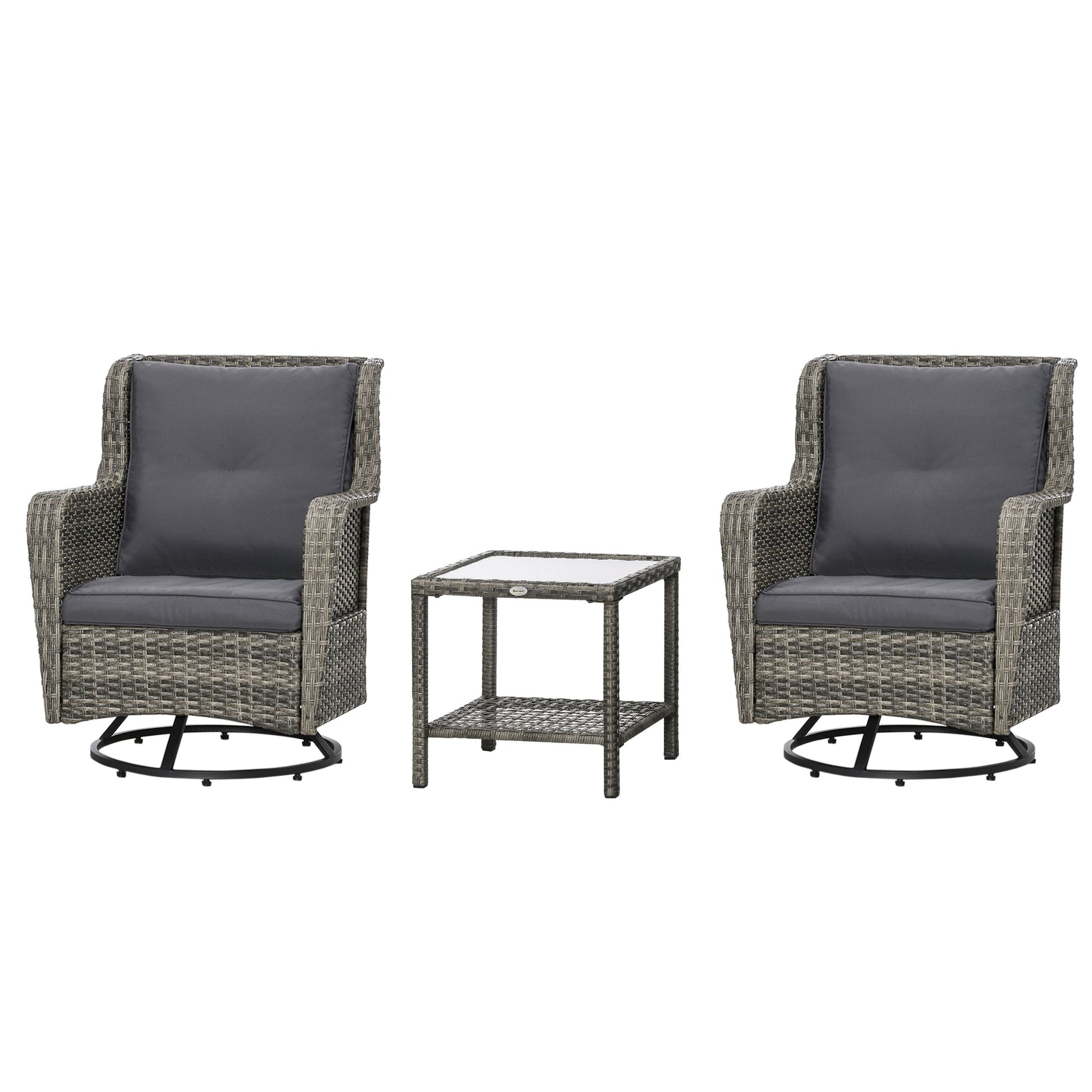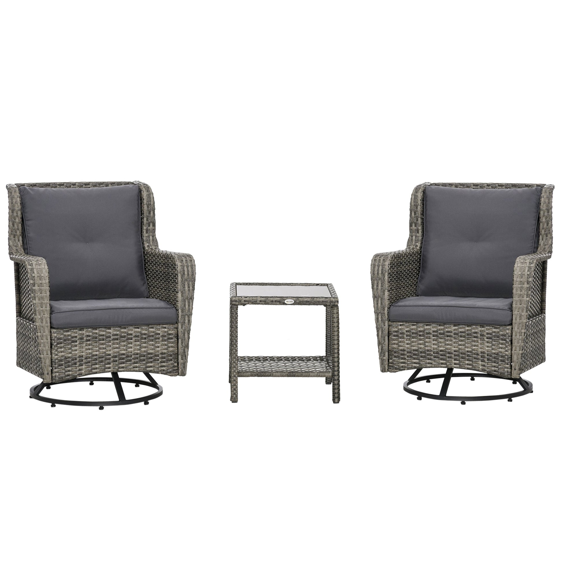 - Two-Tier Outdoor Coffee Table: What's more comfortable than everything in the right place? Our swivel chair set offers an outdoor-ready coffee table. Enjoy dining, drinks, or a game on a wipe-clean surface with storage space underneath.
