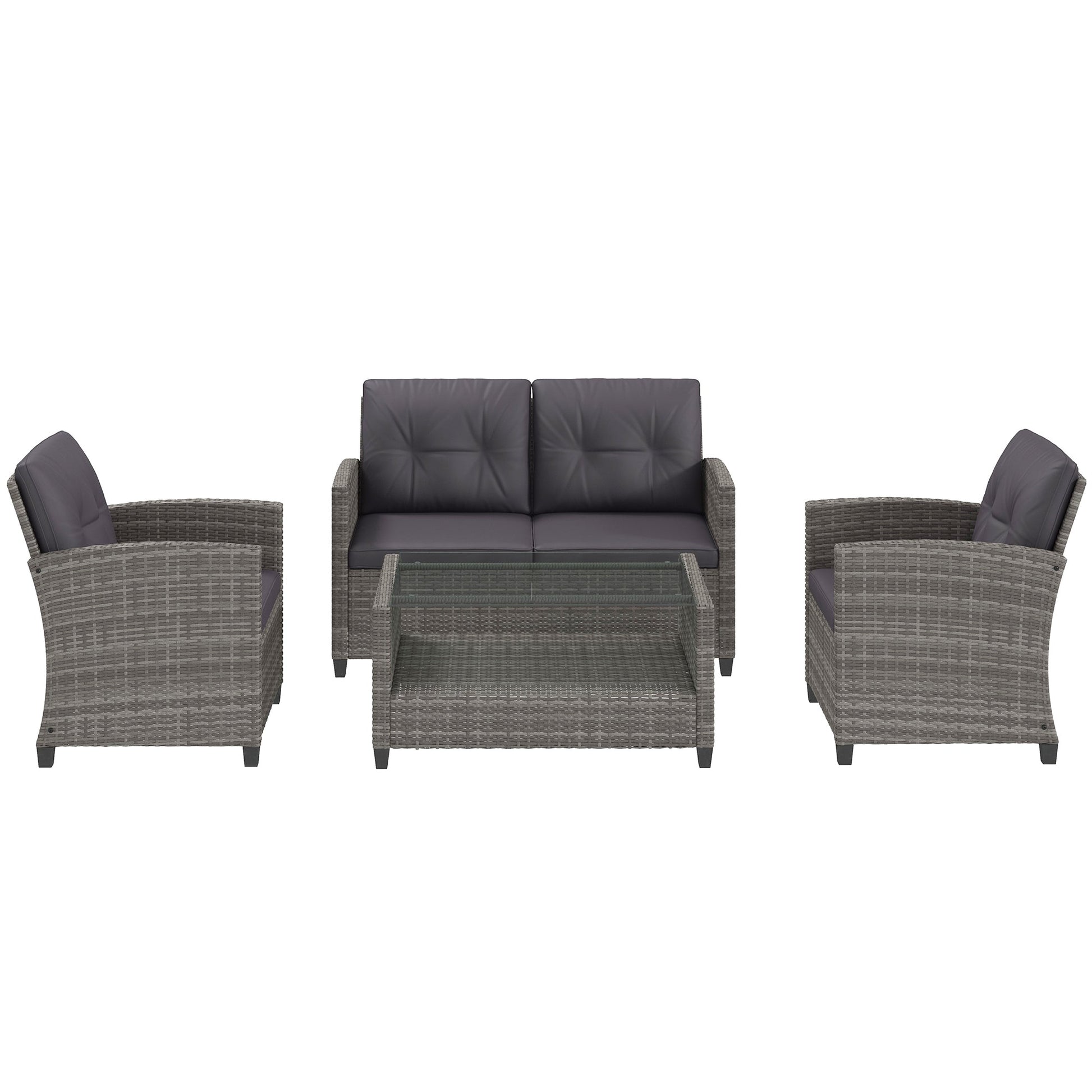 Flexible Outdoor Seating: The Outsunny 4-Piece PE Wicker Patio Set offers multiple layout options with two single chairs, one double sofa, and a two-tier coffee table, perfect for patios, decks, or gardens.