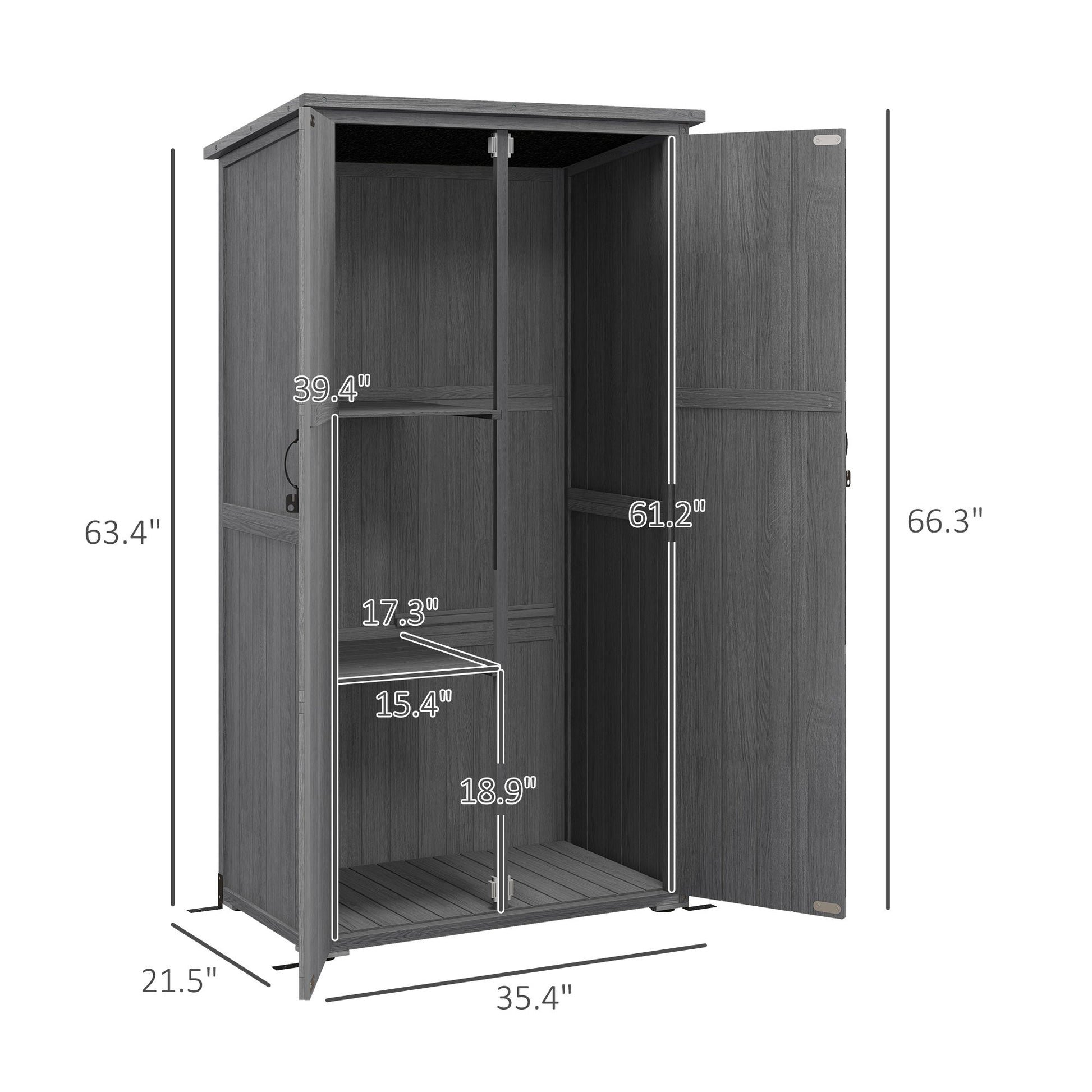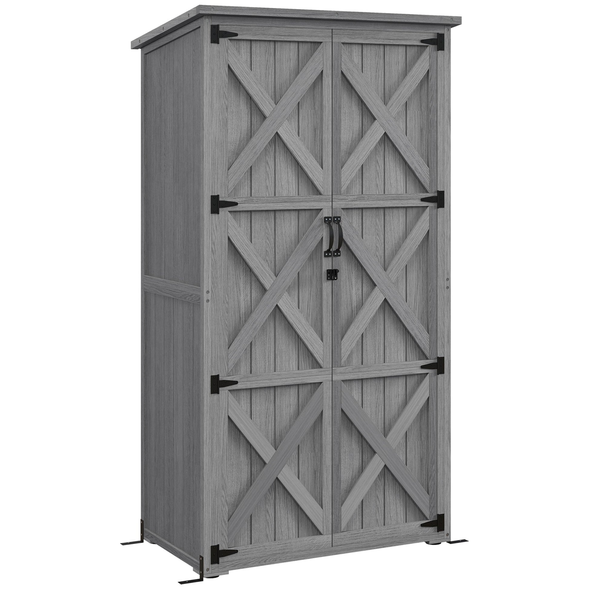 - Vertical Wood Storage Shed: With two shelves to work with, our vertical outdoor storage shed makes it easy to organize garden tools, pool supplies, or other items outside.