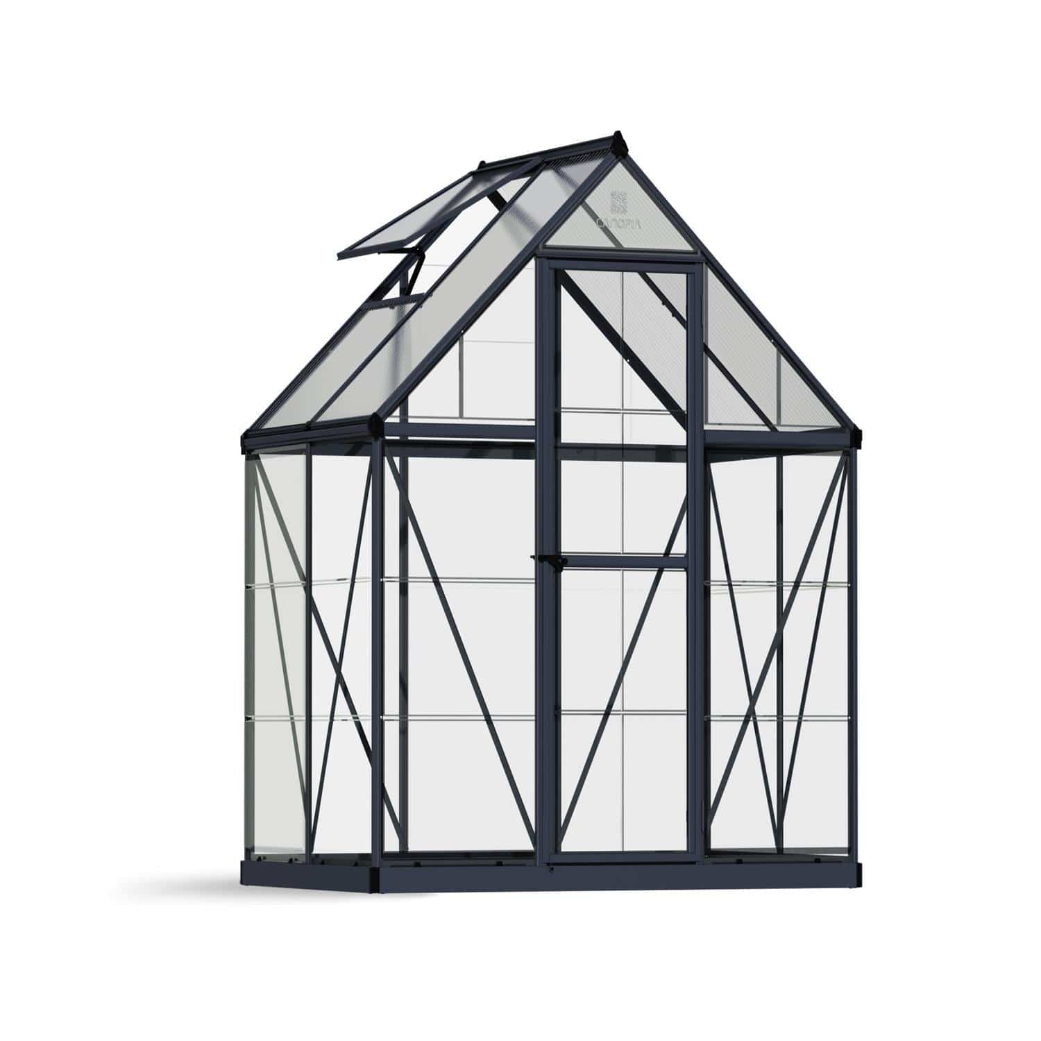 Palram - Canopia Nature Hybrid Series 6' x 4' Greenhouse Kit is an ingenious balance of two advanced polycarbonate panels for the optimum environment. The crystal clear side panels offer over 90% transmission for growth, while the 4mm twin wall roof blocks up to 99.9% of harmful UV rays to prevent plant burn. Add to that a ton of features, and the Nature Hybrid greenhouse is perfect for any growing enthusiast. The integrated rain gutters and down spout disperse rain water to the ends, making it ideal for water conscious gardeners to collect. A roof vent and door with magnetic catch keep air flowing, helping you control the temperature and humidity in your greenhouse. When it comes to set-up, this house is designed as a do-it-yourself project without the need for special tools, so you’ll be ready to start growing in no time. A smart panel slide and lock system connects the frame precisely and quickly into place and polycarbonate panels slide easily into profile channels. The aluminum frame is durable, maintenance free, and rust resistant allowing you to focus on growing instead of maintaining your greenhouse. Palram - Canopia also offers a complete line of accessories designed to make your Nature Hybrid greenhouse more productive, space saving, and protective against the elements.