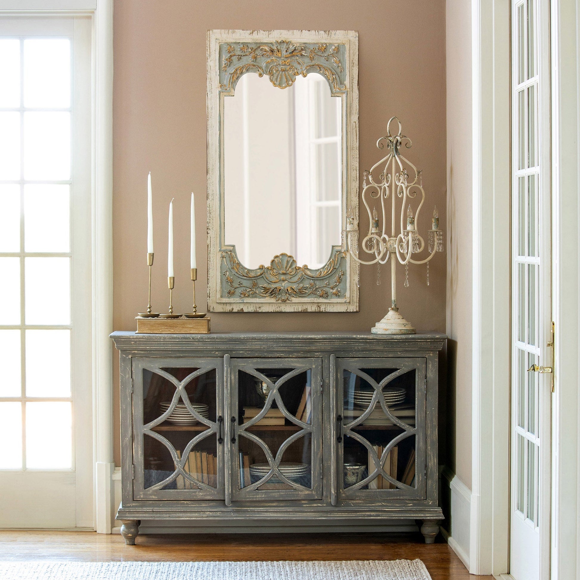 Accentuated by a shell in the relief, the beautiful colors and details of the fir wood frame make our Coquille Carved Wood Mirror a piece of art. This fixture is a unique shape, being a horizontal framed mirror, which enhances its uniqueness and appeal. In the ever-so-popular blue and white combination, this is the perfect wall hanging to add both interest and reflection to your space.