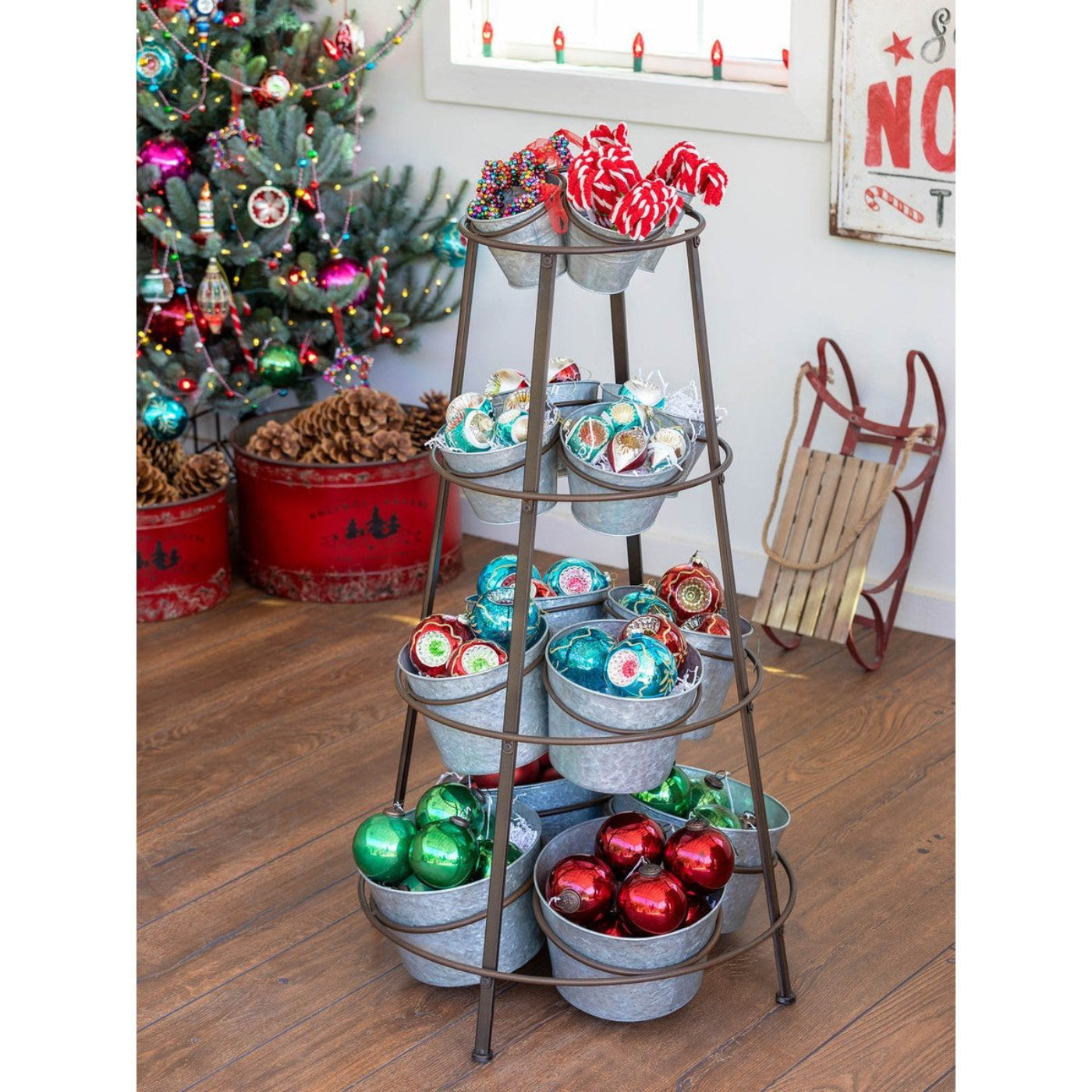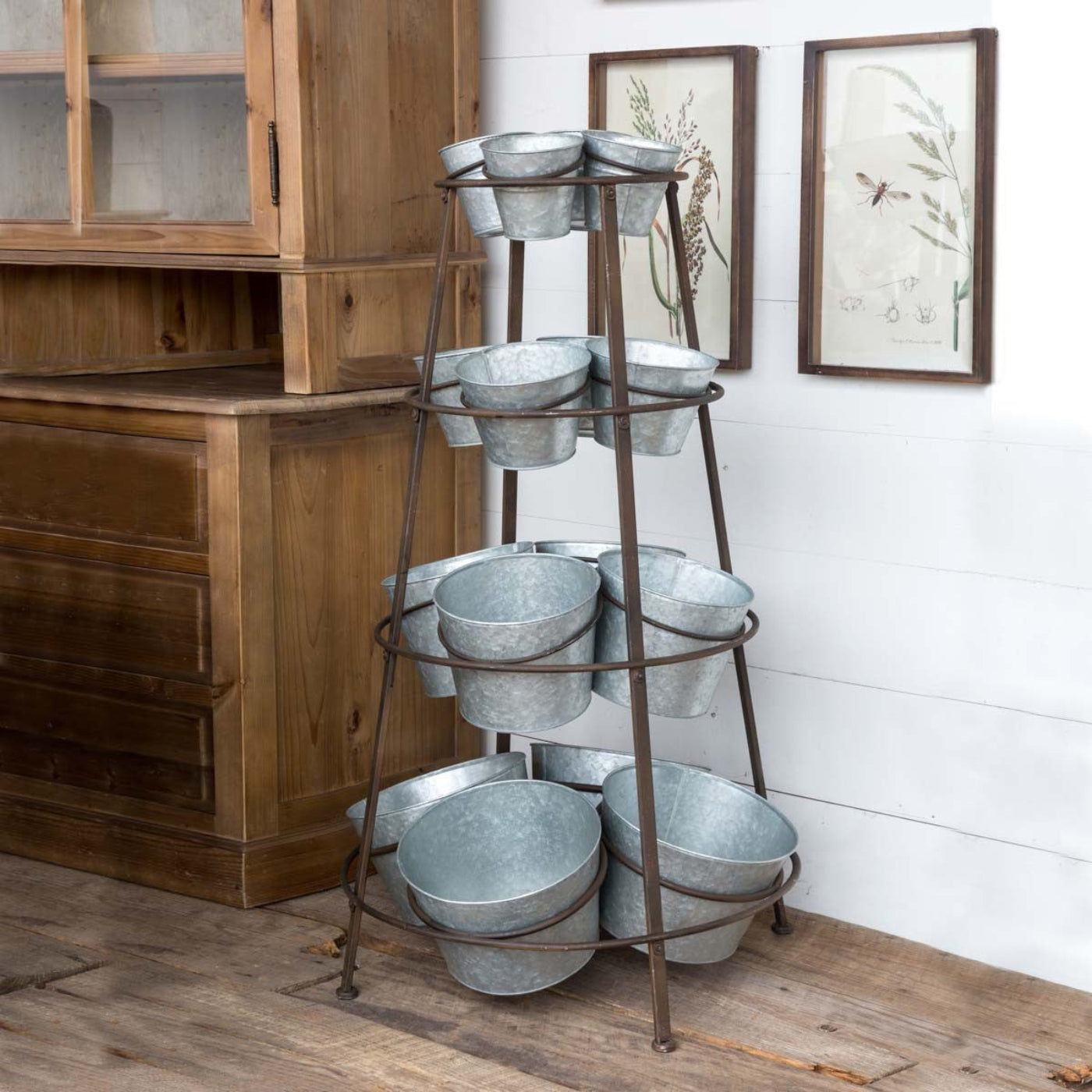Ideal for a limitless variety of storage and display options, this market tower features a cast iron frame with four tiers of graduated metal tubs.