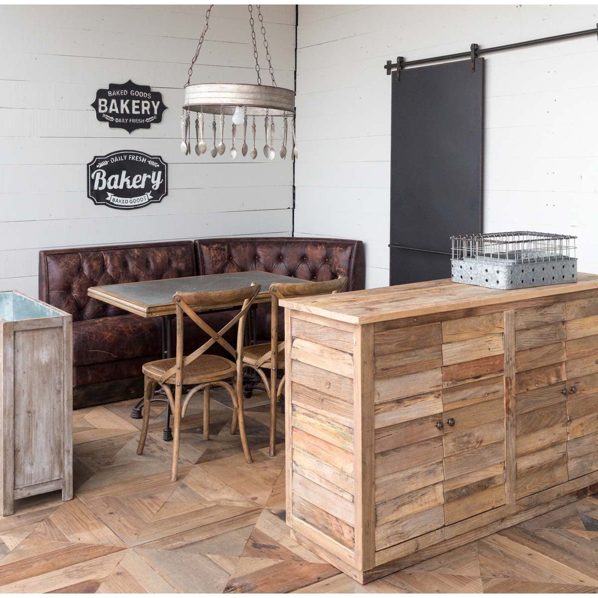 A beautiful combination of rustic and industrial styles, this cafe? table features a zinc top framed by reclaimed wood and elegant cast iron base.