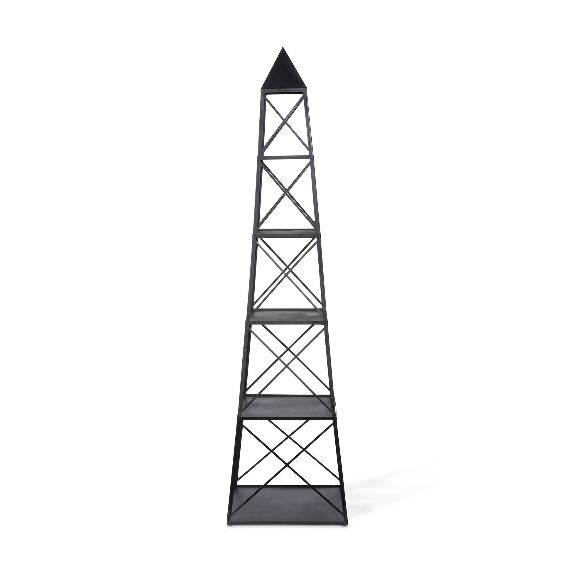 The Stackable Antique Black Obelisk is a lightweight display shelf with ample storage. Its five graduated tiers are crafted of iron accented by crisscross detailing and topped off with a signature pyramidion. Open on two sides, the stackable storage is easy to move and comes apart so that it can be displayed in multiple ways.
