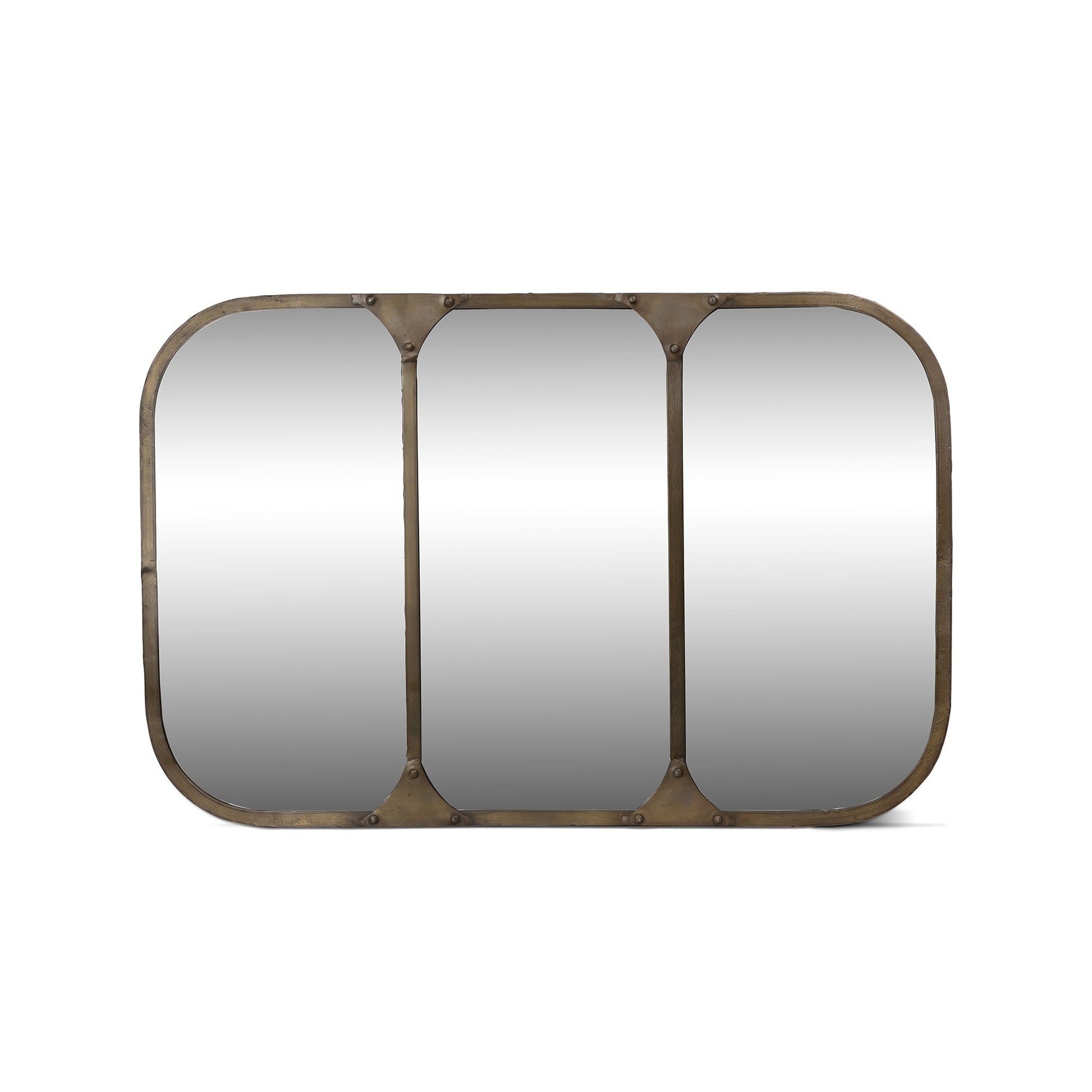 A: A stylish wall mirror featuring a sleek iron frame with a brass finish, designed for durability and timeless elegance.