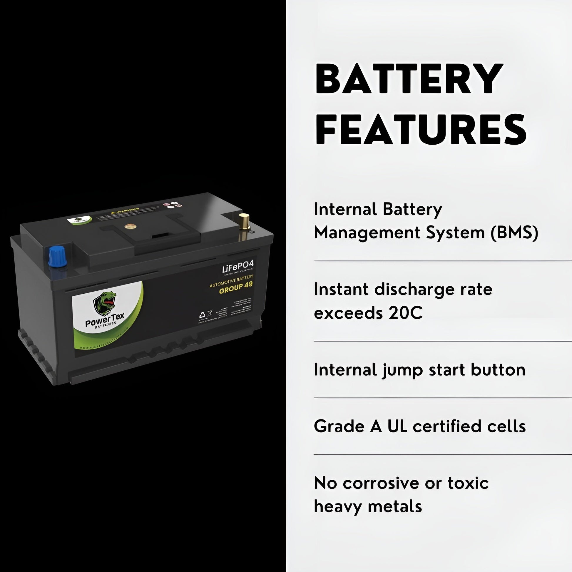 Maximized Longevity: Elevate your driving experience with the Powertex Lithium Iron Phosphate car battery, an optimal solution for maximizing your vehicle's potential. Crafted for extended durability surpassing conventional car batteries, this powerhouse delivers enhanced power and prolonged longevity. With LiFePO4, revel in sustained performance and unwavering reliability that elevates your journey every mile of the way.