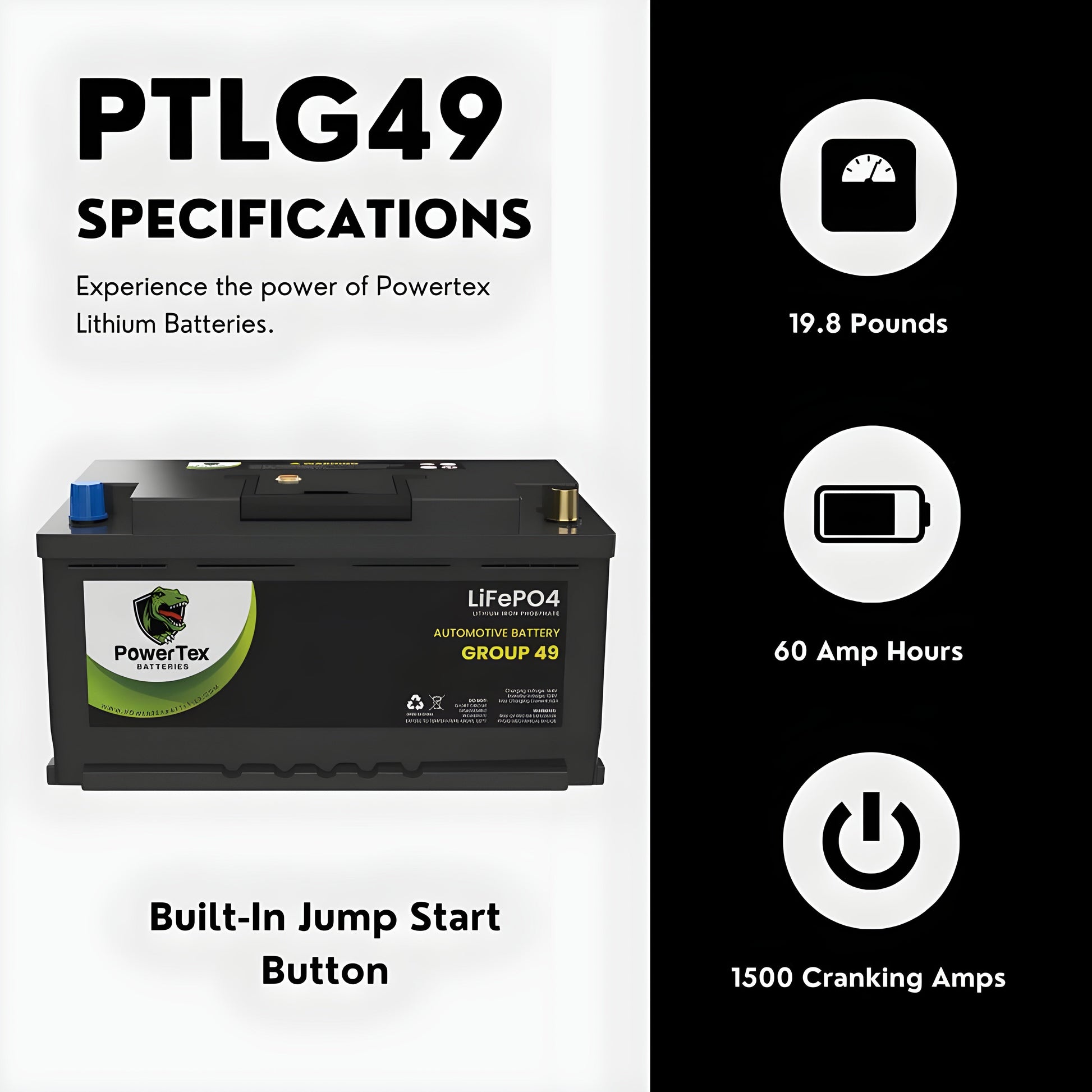 PowerTex 2022 Ram Promaster 1500 V6 3.6LReplacement Car Battery BCI Group 49 Lithium LiFePO4 Automotive Powertex Battery