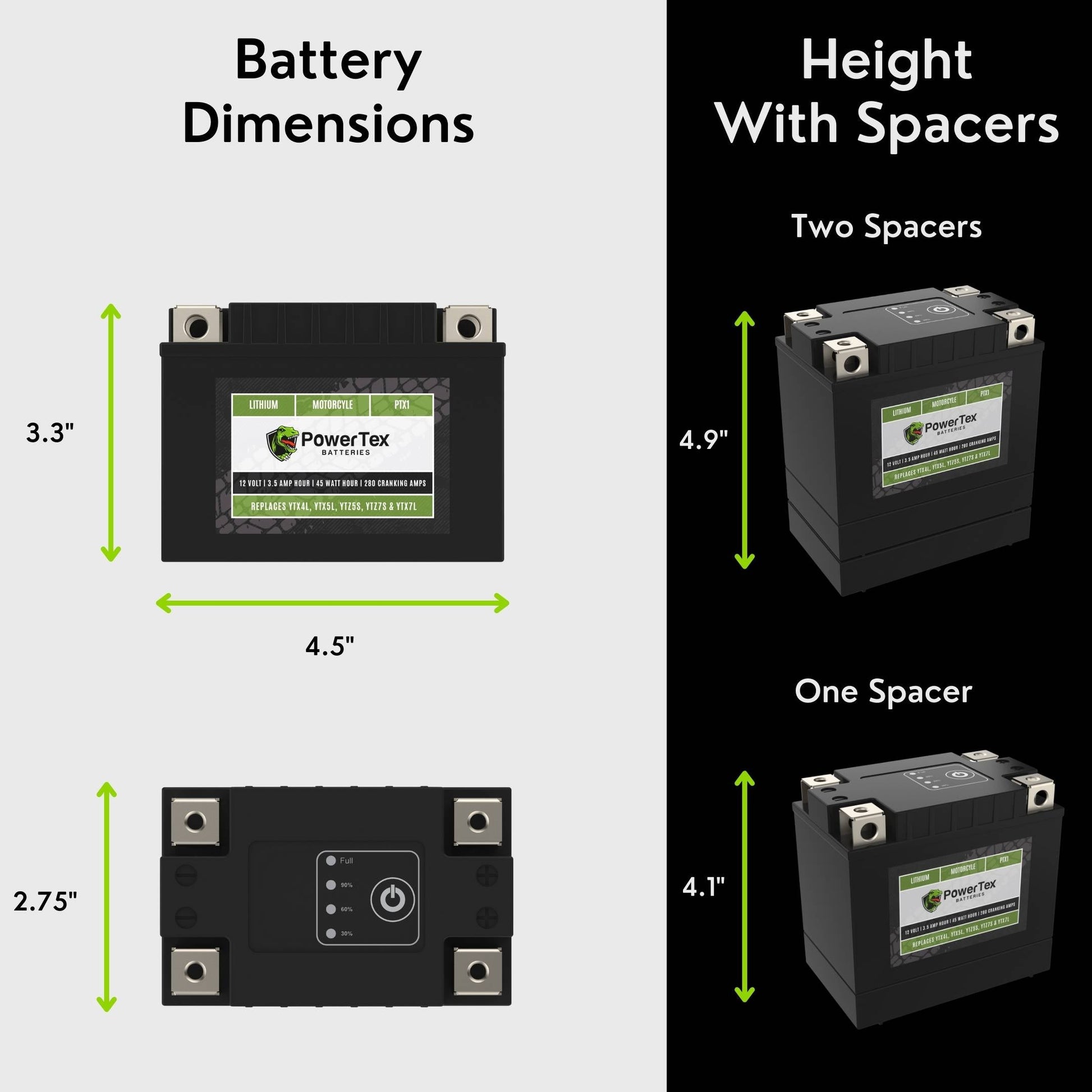 Upgrade your ride with the Powertex PTX1 Lithium Powersport Battery, the ultimate replacement for traditional lead-acid batteries. This advanced lithium iron phosphate (LiFePO4) battery features four terminals for flexible installation in any position and includes universal spacers to ensure compatibility with YTX4L-BS, YTX5L-BS, YTX7L-BS, YTZ5S, YTZ7S, and YTZ8V models. Perfect for motorcycles, ATVs, UTVs, snowmobiles, scooters, and more, it combines cutting-edge technology with unparalleled versatility.