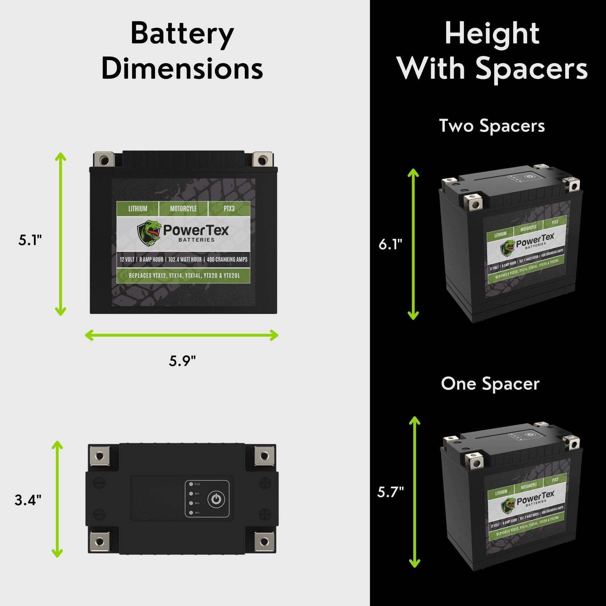 Upgrade your ride with the Powertex PTX3 Lithium Powersport Battery, the ultimate replacement for traditional lead-acid batteries. This advanced lithium iron phosphate (LiFePO4) battery features four terminals for flexible installation in any position and includes universal spacers to ensure compatibility with YTX12-BS, YTX14-BS, YTX14H-BS, YTX14L-BS, YTX16-BS, YTX16-BS-1, YTX20CH-BS, HYB16A-AB, GYZ16H & GYZ16HL models. Perfect for motorcycles, ATVs, UTVs, snowmobiles, scooters, and more, it combines cutting-edge technology with unparalleled versatility.