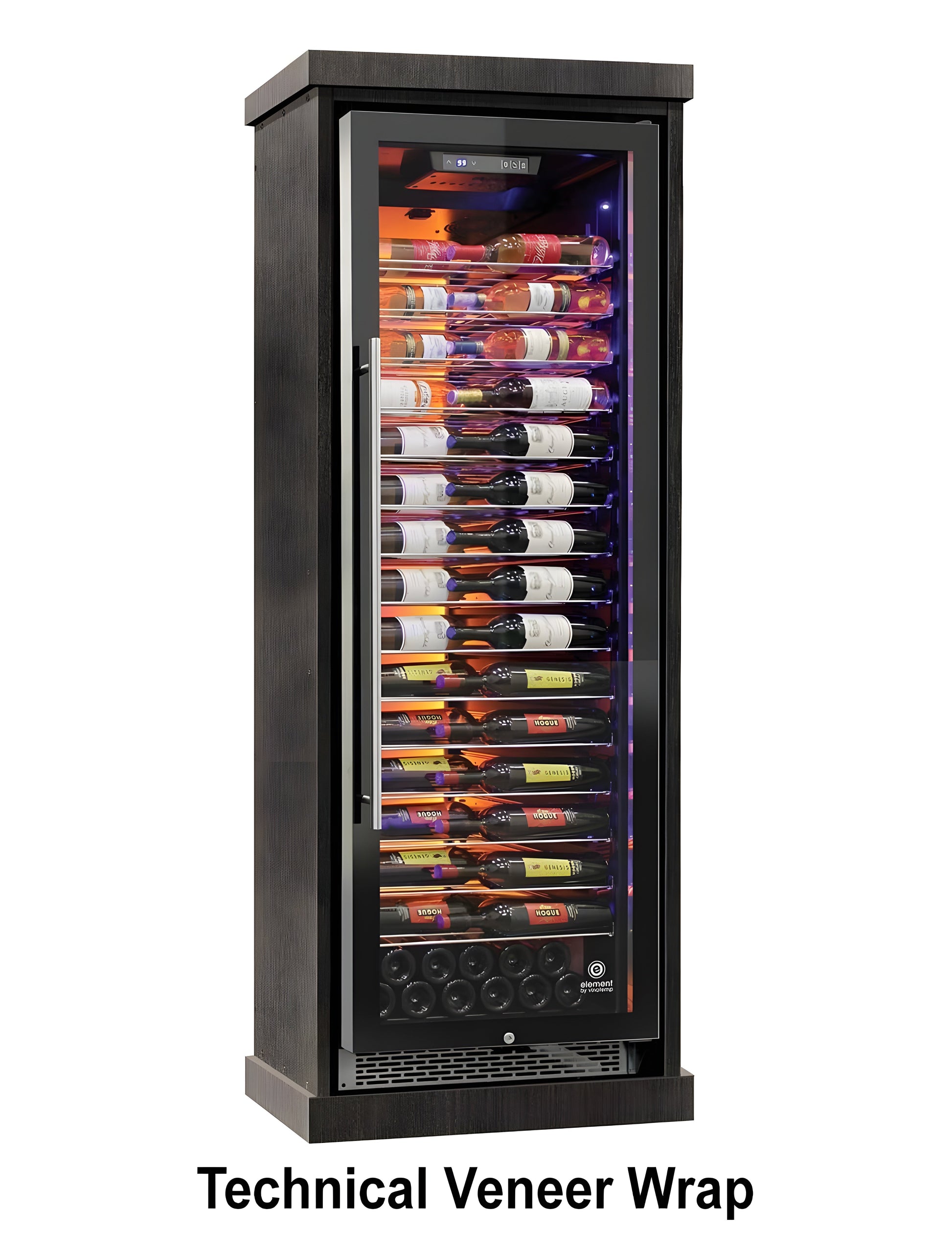 Create a stylish, contemporary look for your home with a technical veneer wrap for your wine cooler. This custom-made wood paneling wraps around your entire wine cooler to make it smoothly blend in with your furniture. Wood wrap as shown is at an additional cost. If adding this wrap, it must ship with the unit (shipping cost is included in price). Veneers are available in Okanagan, Spring Blossom, Exotic Walnut, and Chocolate. Please call 800.777.8466 for a quote.