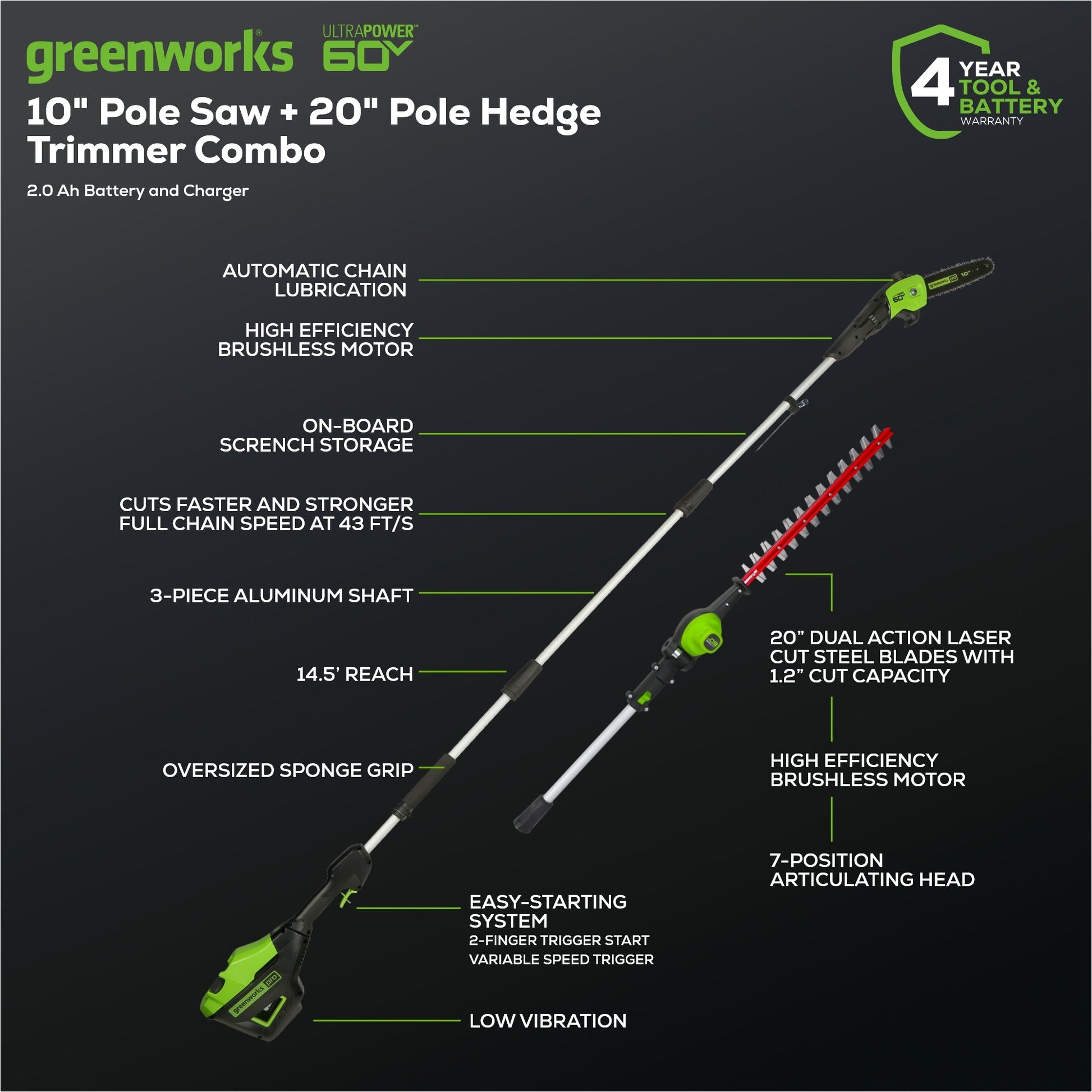 Dual Functionality: Combines a 10" pole saw and 20" pole hedge trimmer for versatile yard maintenance.