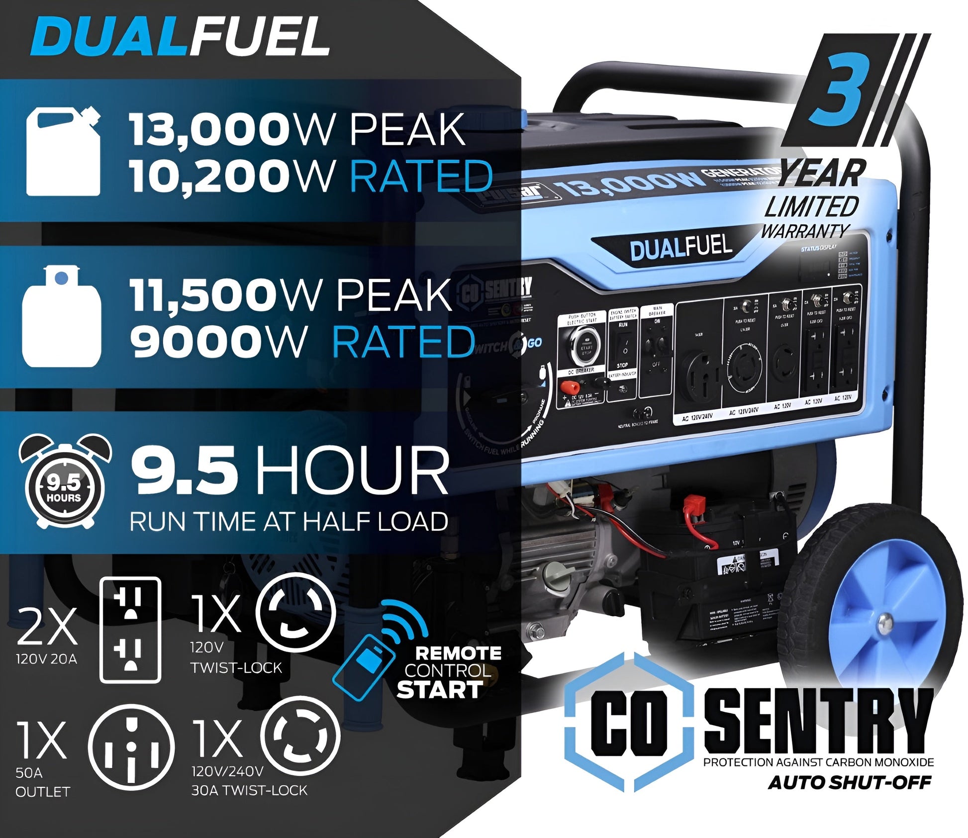 A: A 13,000W dual-fuel generator with recoil, remote, and push-button start, featuring CO Alert for safety, designed for high-power needs in residential, commercial, and emergency situations.