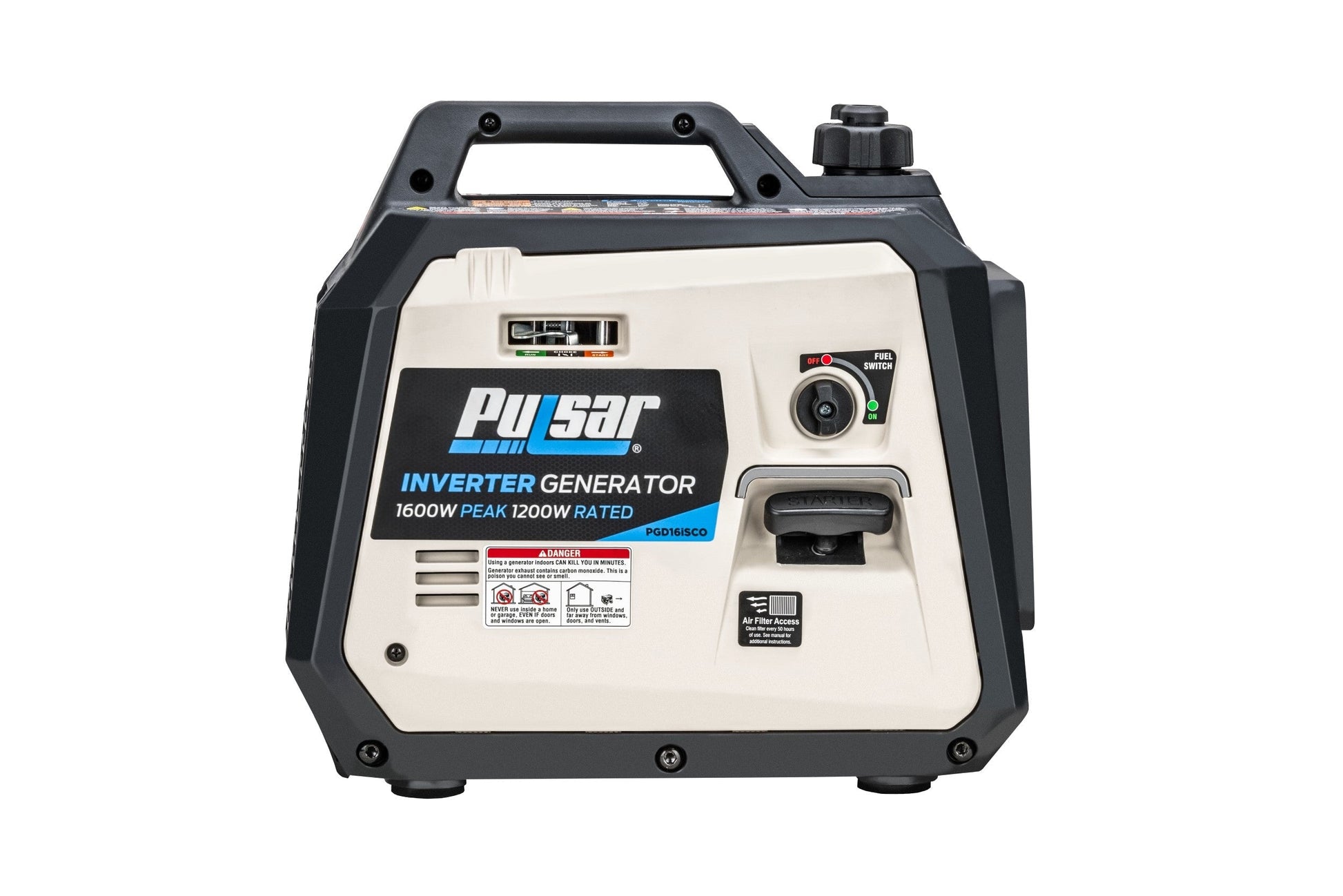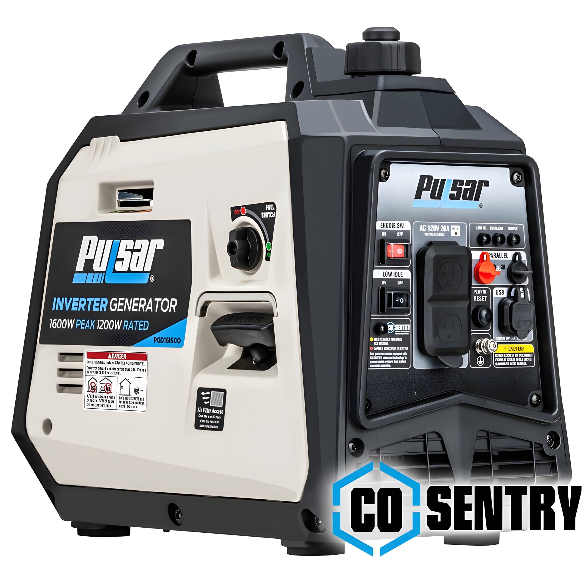 The Pulsar PGD16iSCO inverter generator provides super-quiet performance and weighs only 24 pounds, making it perfect for camping trips, outdoor events, the job site, and much more. This generator provides clean and stable energy with less than 3% total harmonic distortion making it safe to run laptops, cellphones, monitors, tablets, and other sensitive electronics. Produce up to 1600 peak watts and 1200 rated watts of power. Our 57cc engine operates at 56 decibels and is equipped with our CO Sentry sensor which protects you and your family from excess levels of carbon monoxide. The forward-facing panel is equipped with two 120V NEMA 5-20R receptacles, two USB-A ports, parallel ports, and low idle control to maximize run times. Need more power? Effortlessly link two units in parallel to double your power (kit sold separately).