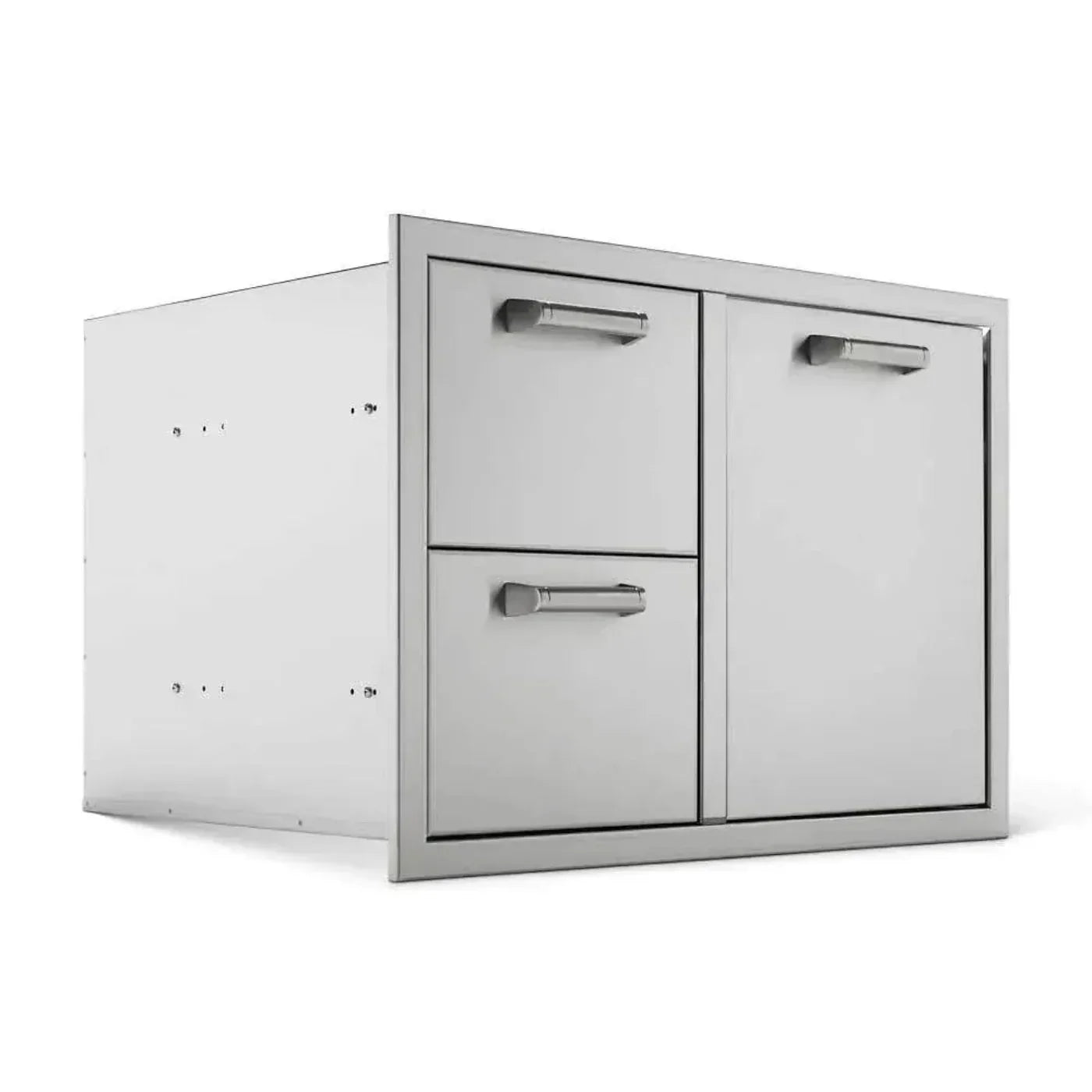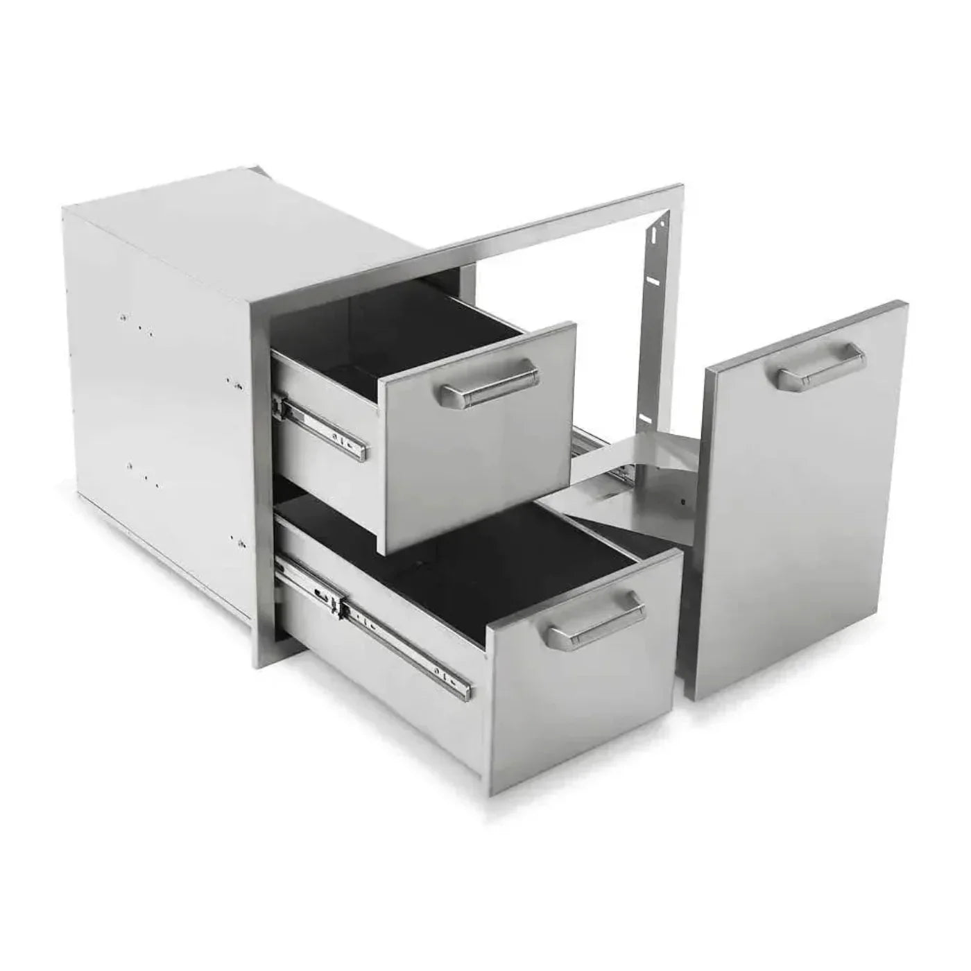 Furthermore, the two stacked drawers on the other side of the cabinet provide additional storage space for utensils, grilling accessories, or other kitchen essentials, allowing you to keep your outdoor kitchen neatly organized and clutter-free. Equipped with commercial-grade, ball-bearing drawer glides, these drawers offer smooth and quiet operation, enhancing the overall user experience.