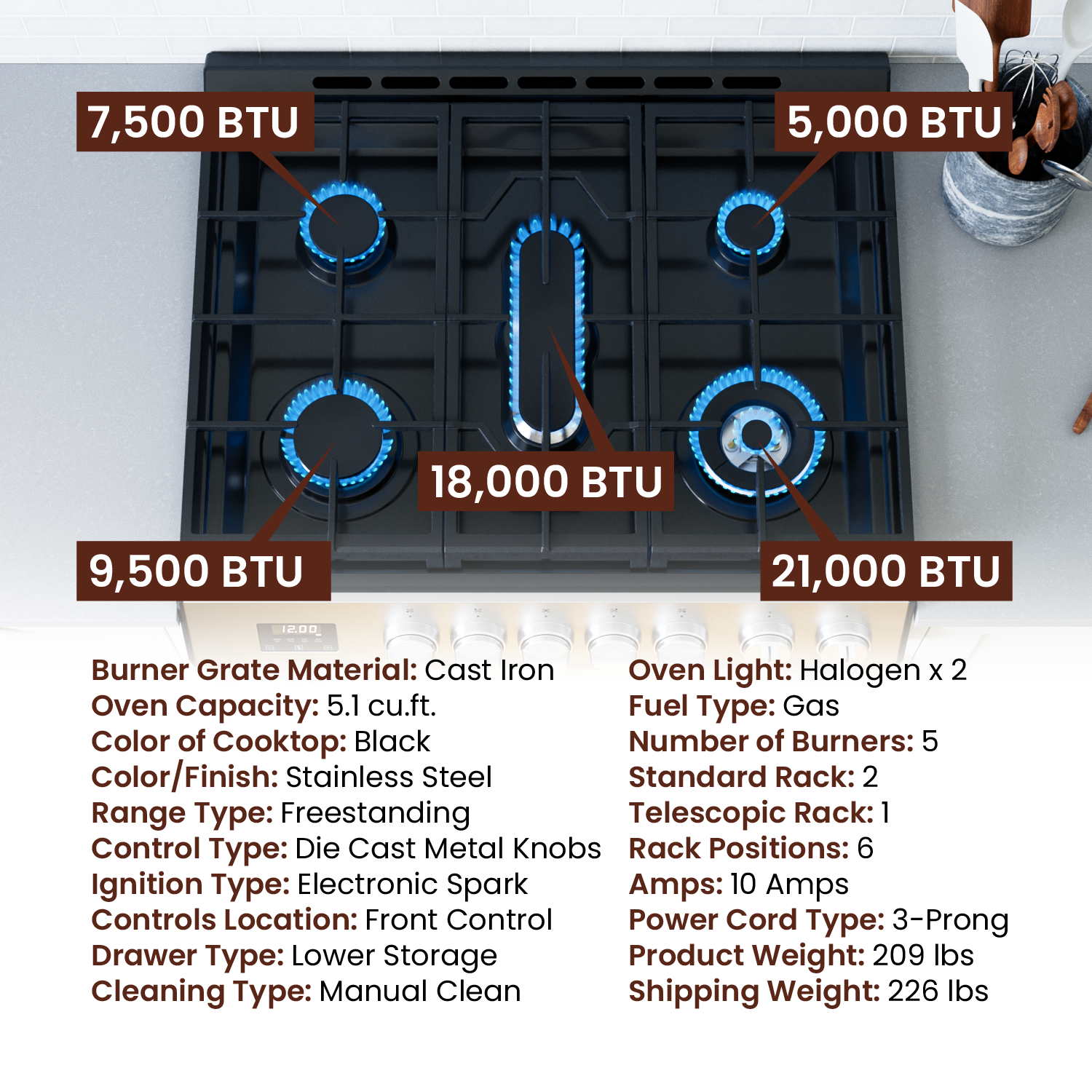 30" Range: Designed for versatility, featuring 5 burners, including a griddle burner, to handle everything from simmering to searing with ease.