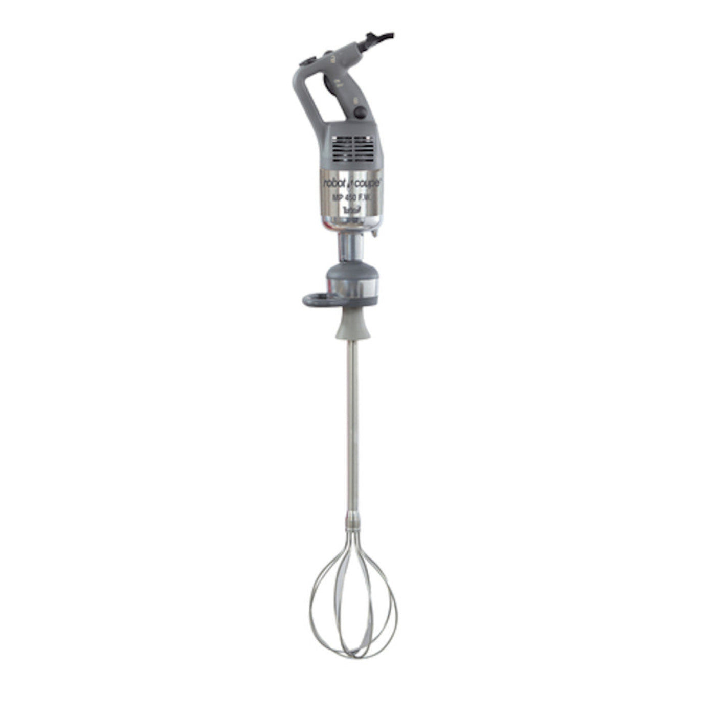 The Robot Coupe MP 450 XL FW is a 27" variable speed immersion blender with a whisk attachment, designed for high-volume kitchens.